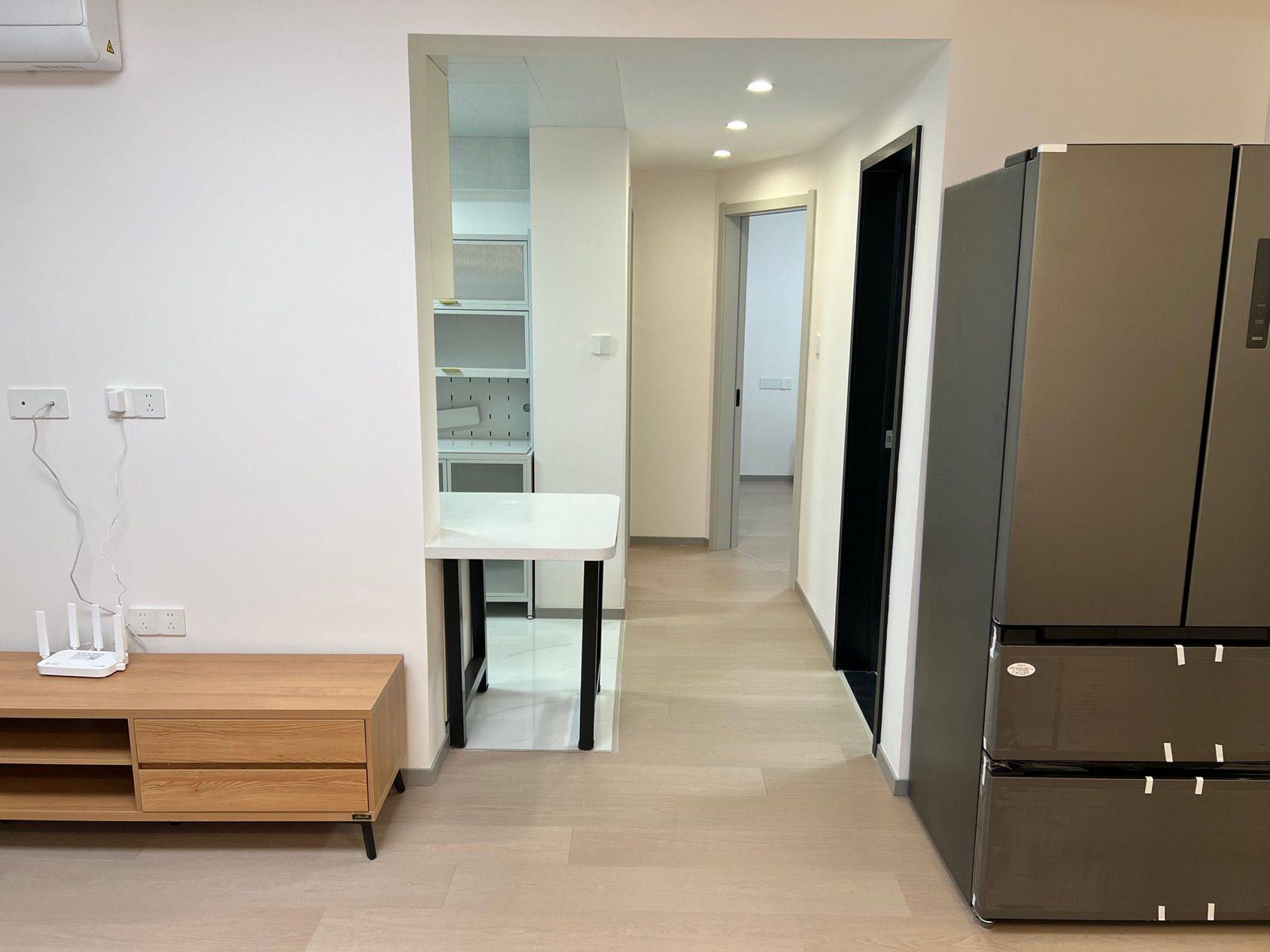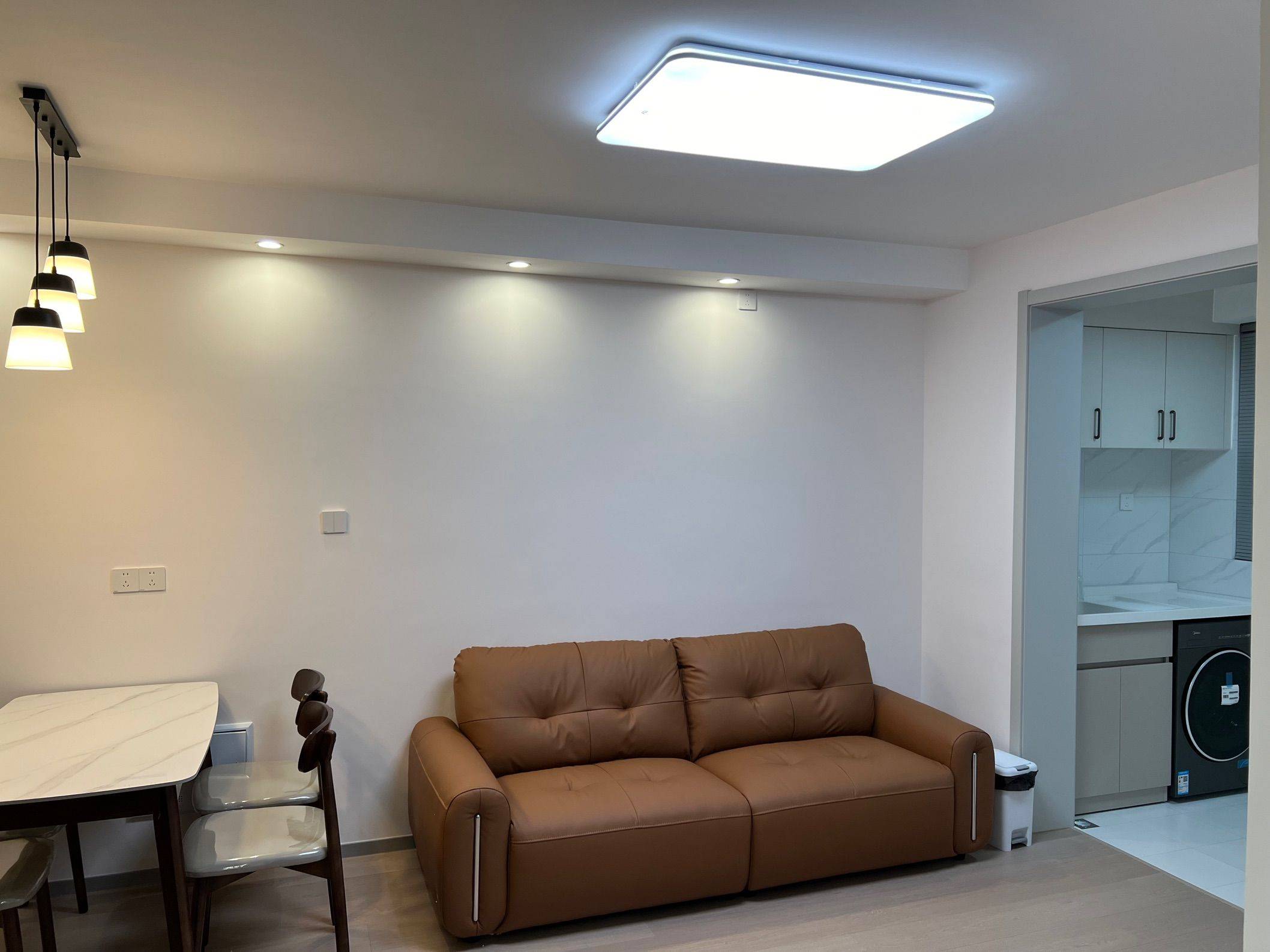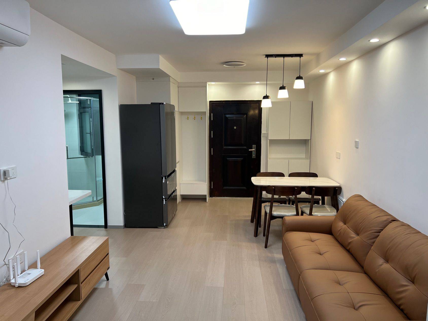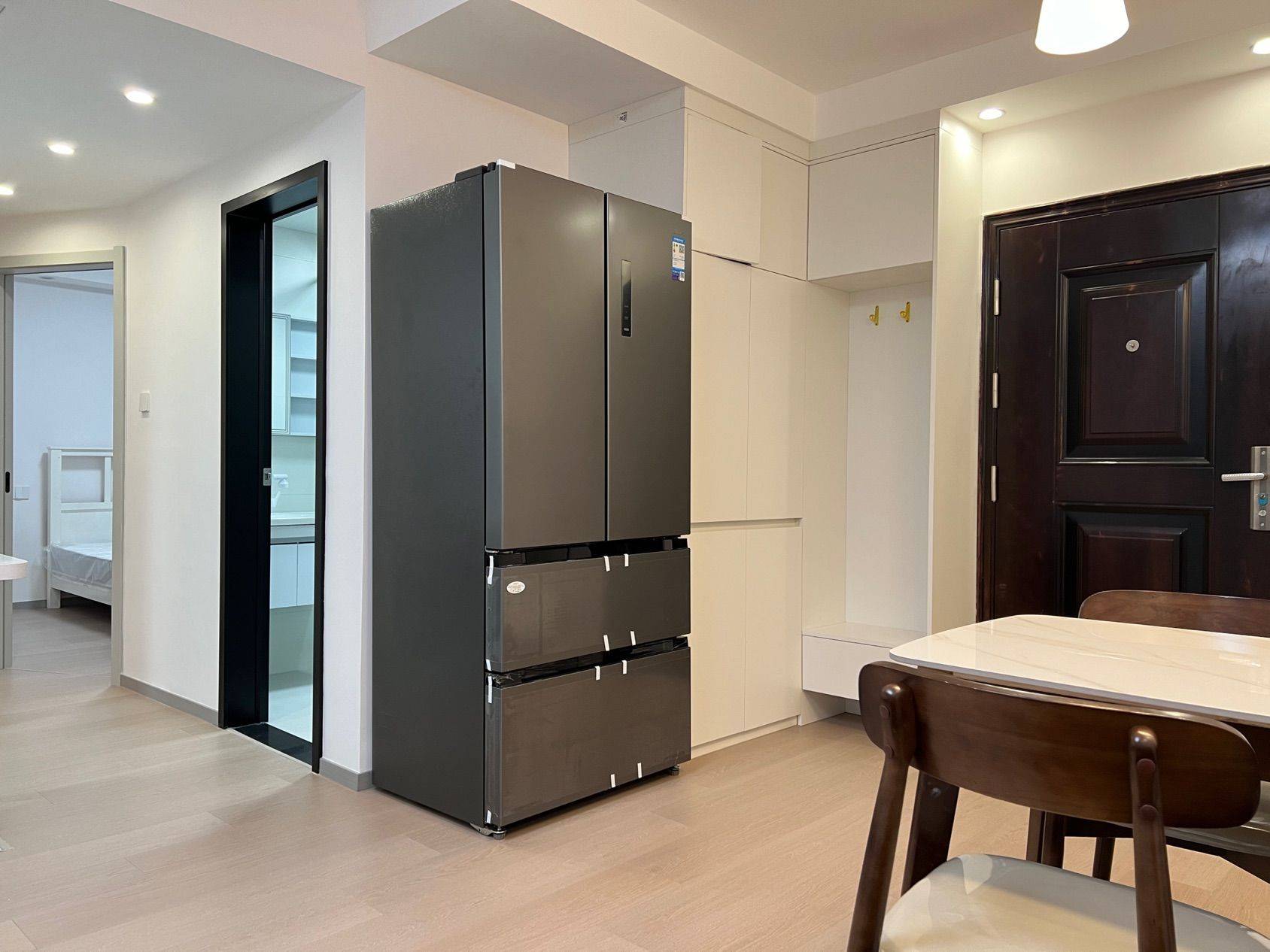 二室一厅,套内55平。科勒前置过滤器(拒绝水箱清洗问题),500M宽带+Wi-Fi6路由器,玄关2.8平迷你衣帽鞋区,7层*4双独立鞋柜,芝华仕中古风包豪斯牛皮沙发,智联10kg洗烘一体,语音控制晾衣架,532L法式冰箱,语音控制智能马桶,遥控开关客厅主灯/主卧灯,主卧芝华仕五星床垫(厚30cm),次卧穗宝椰棕抑菌床垫(厚18cm)。仅电视及微波炉是旧的(未展示),其余全新未使用。两年合约租金可降,租满两年可额外退半月租金。