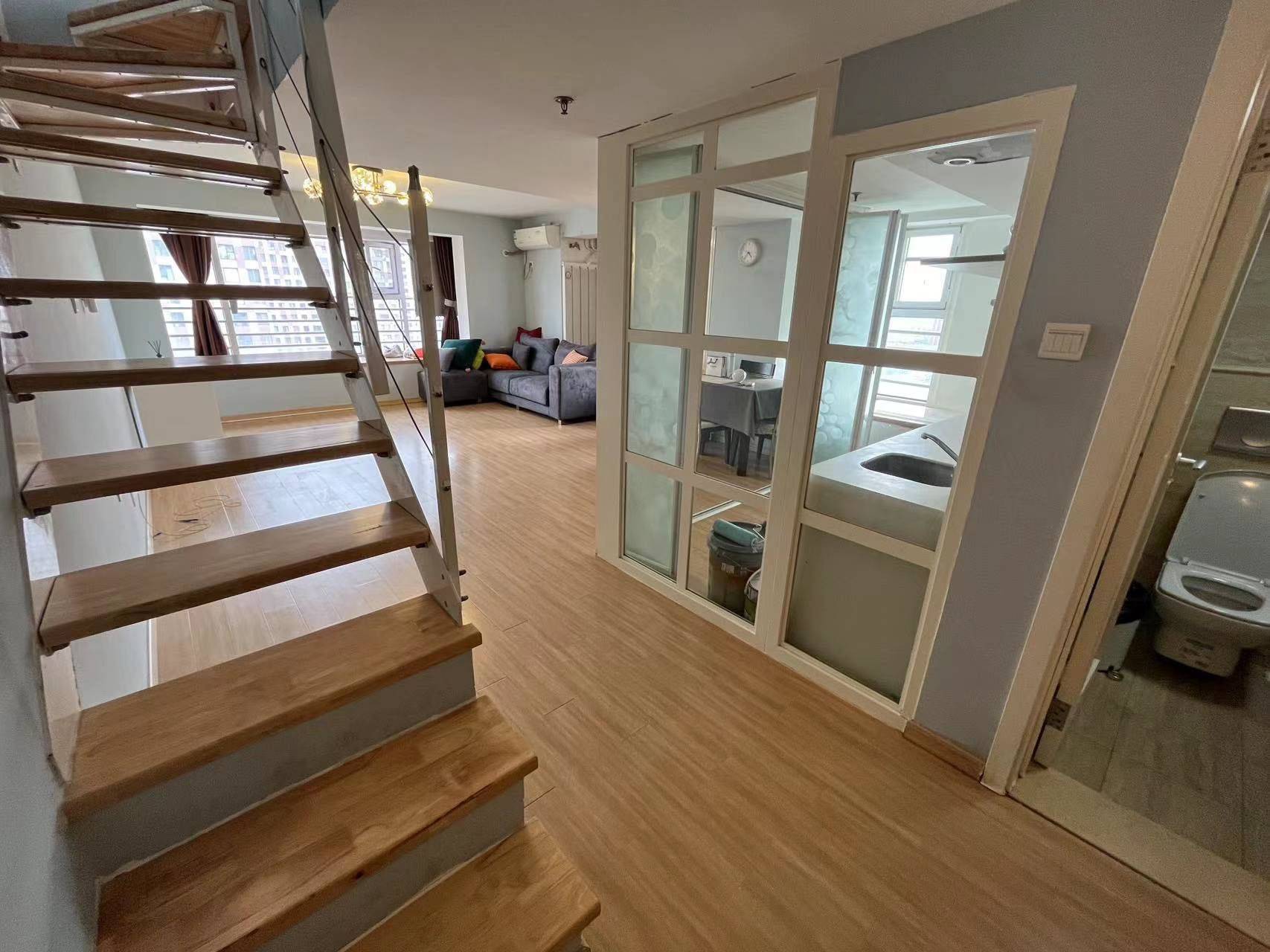 金奥国际loft 可拎包入住 位于丽江道(7号线 10号线)步行350m,两站到达天塔且距离奥城、龙湖天街、天塔位置都很近。接受短租捡漏价,之前租3200。房子很大,一楼有60多平,二楼也一楼差不多大。整屋使用面积110平米多。两个卫生间,楼上两个卧室。采光非常好!!!楼下711奶茶绝味鸭脖理发店超市各种吃的等等一应俱全。
