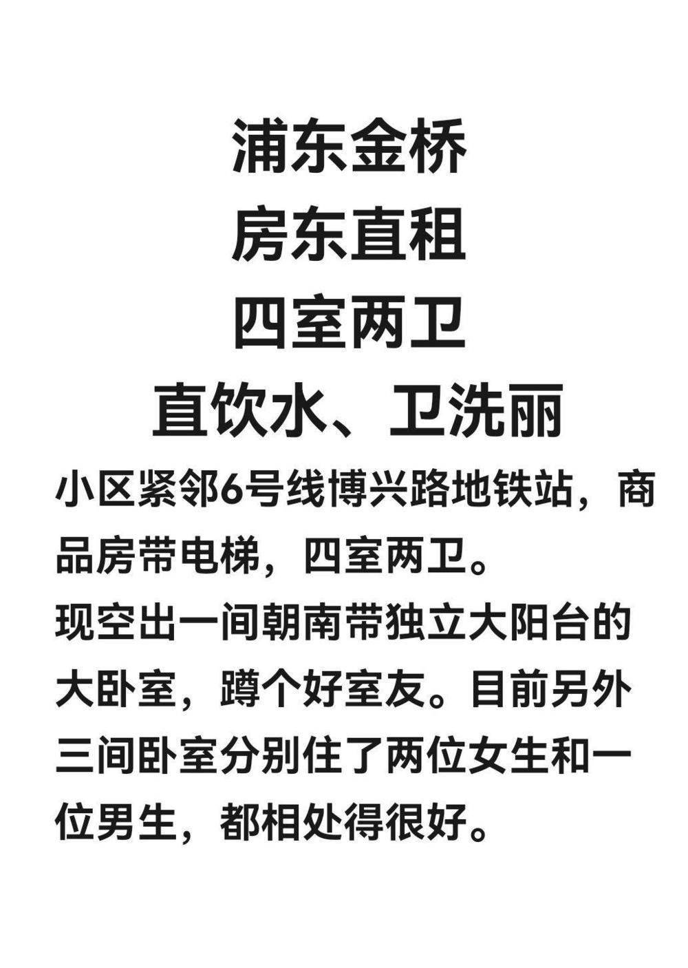 【浦东金桥地区】 现空出一间朝南带独立大阳台的大卧室,蹲个好室友。目前入住了两女生和一个男生,都相处得很好。 这房子我已出租近十年,但丝毫没有越住越旧的感觉。这些年来,设施一直在更新,智能门锁、智能马桶、直饮水系统等都已配齐,完全能跟上现代生活的需求。 我也非常理解大家对于居住品质的在意,以及可能对退租事宜有所顾虑。因此,尽管我希望寻得长租住客,但若您因故需要提前退租,我也愿意妥善协商,不会让合约成为负担。 此外,我长期与一位可靠的维修师傅合作,房屋出现任何问题都能及时解决。在我看来,能用沟通和处理好的事情,就不必耗费彼此的情绪。 #房东直租 #浦东租房 #金桥房源