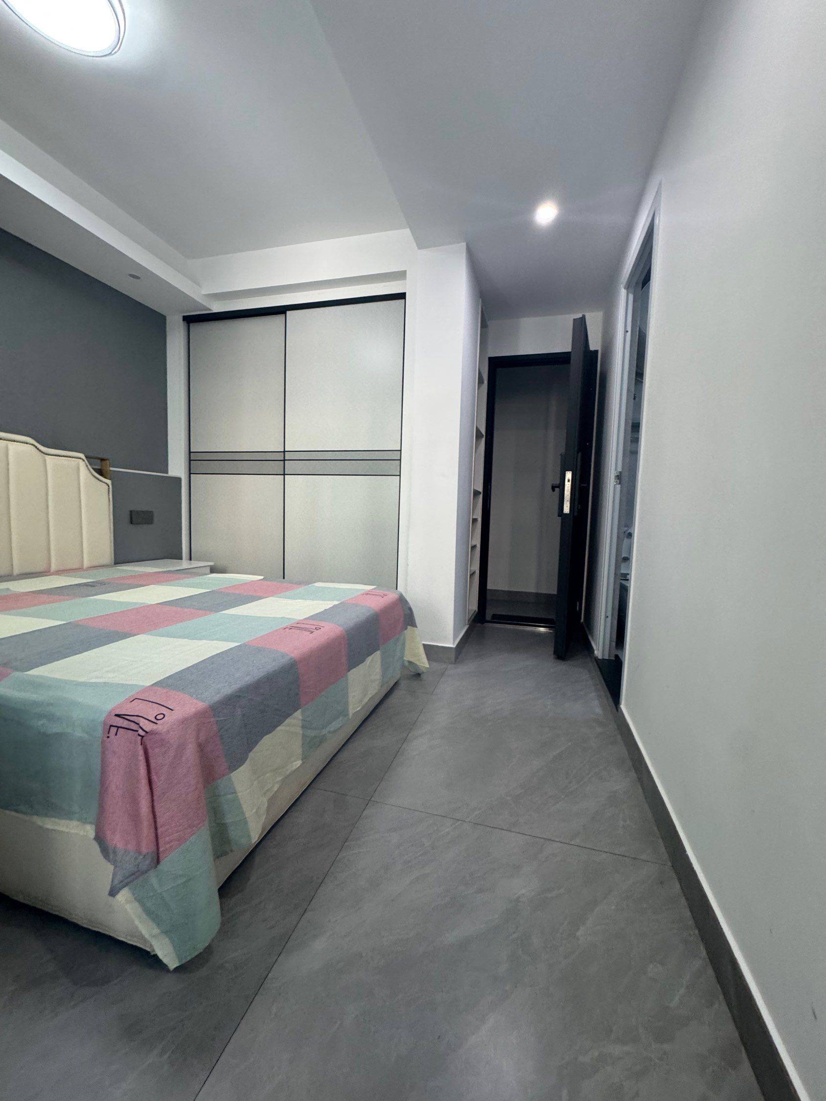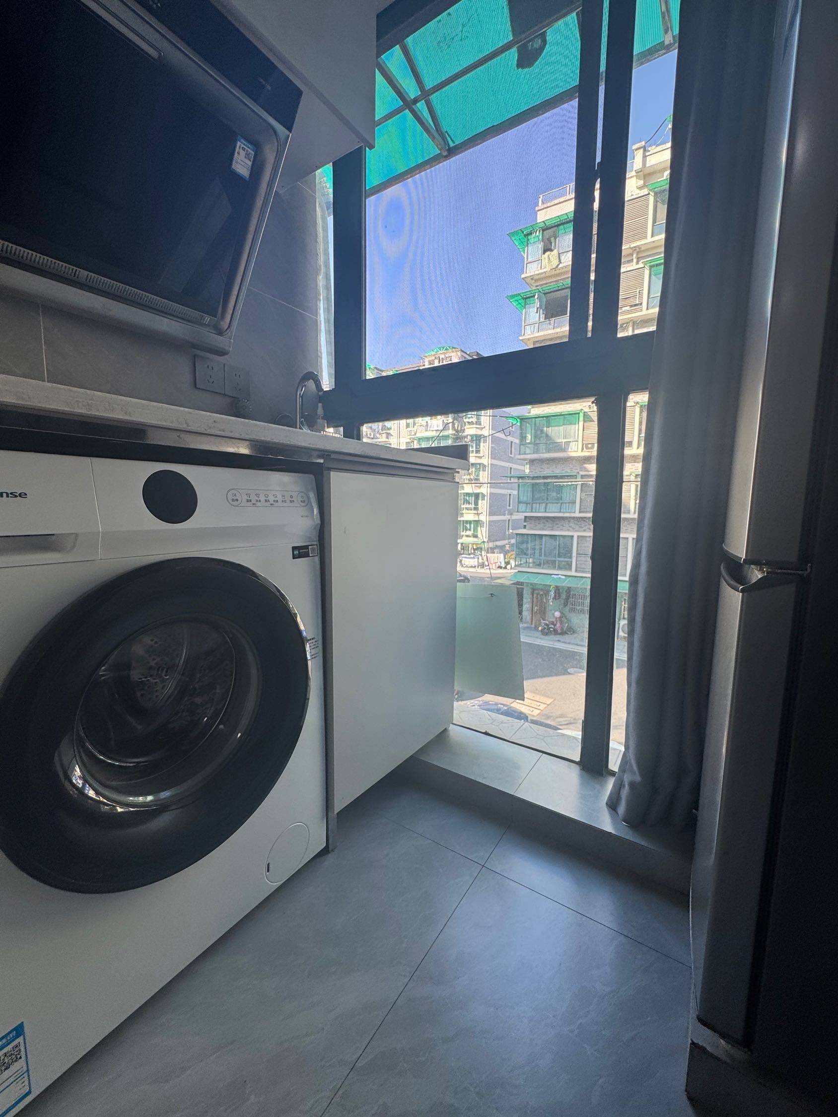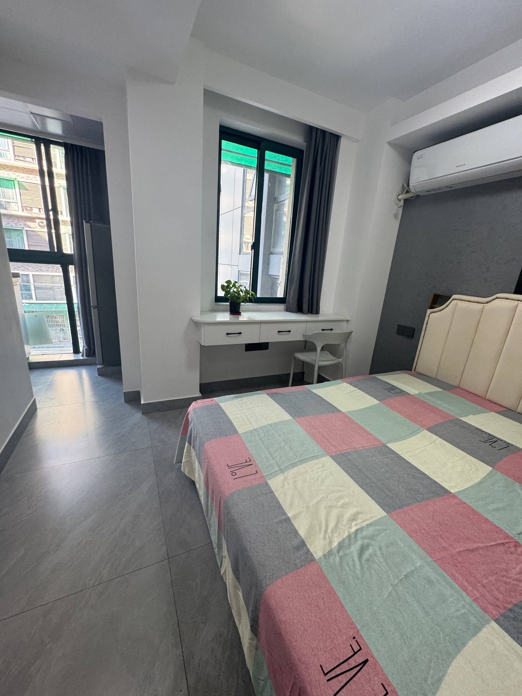 一室一卫一厨单间+小阳台、干静舒适、大床、大衣柜、10公斤大滚筒洗衣机、大冰箱、电梯房。卫生间干湿分离。