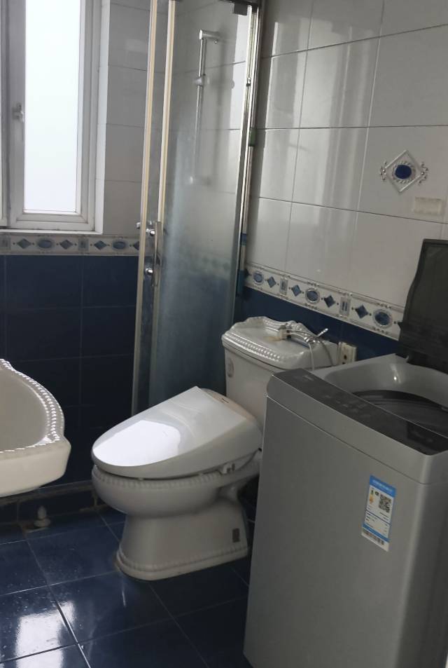 卫生间: 干湿分离,洗漱台(有置物台、镜子)、淋浴间(窗台、短晾衣杆可放置洗浴用品、推拉门外有挂钩可放置浴巾等)、自动洗衣机、暖风机(房东预留)。