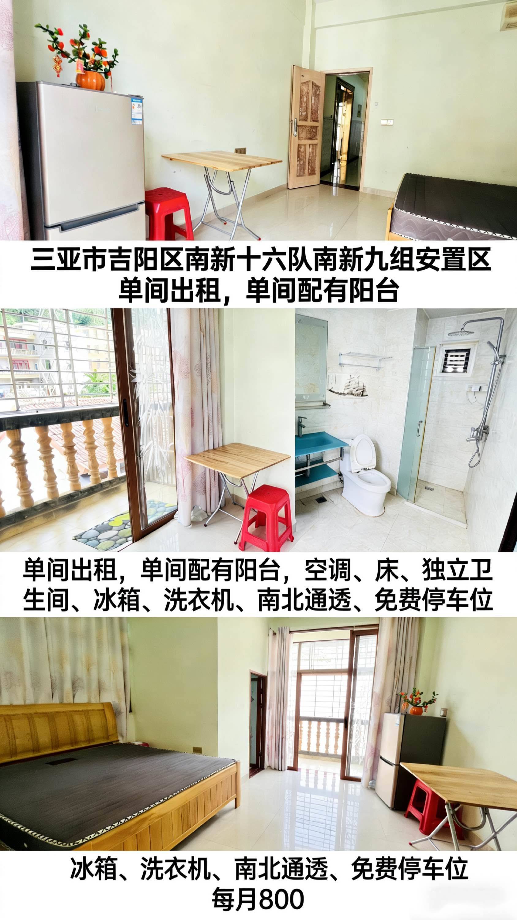 三亚市吉阳区南新十六队南新九组安置区 单间出租,单间配有阳台,空调、床、独立卫生间、冰箱、洗衣机、南北通透、免费停车位 每月800
