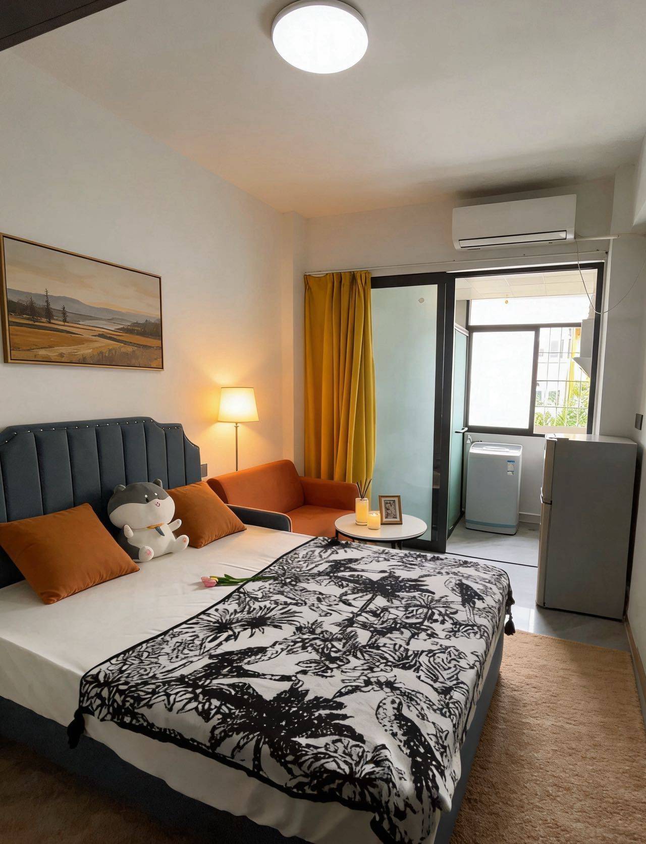 房间里家电都有配备,就差你带床品三件套过来,直接住。
