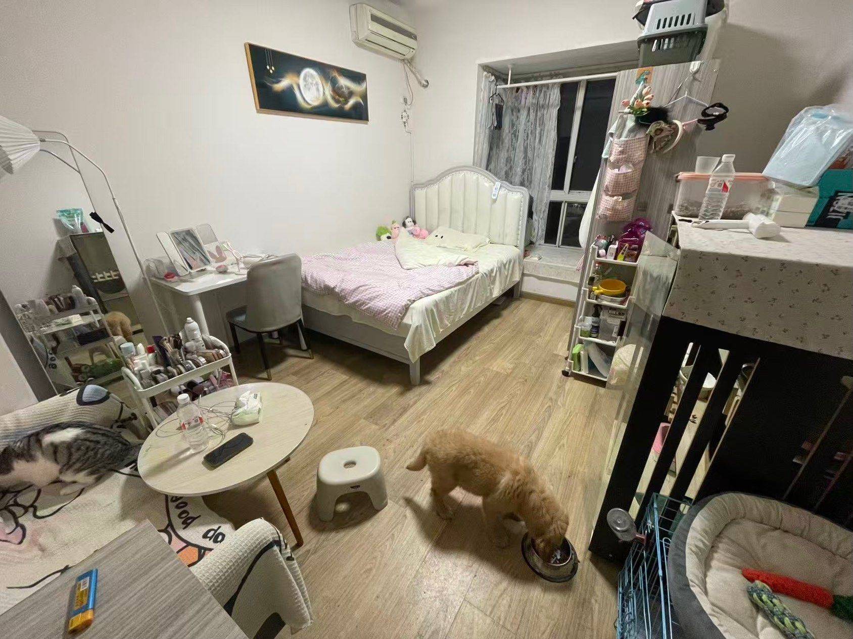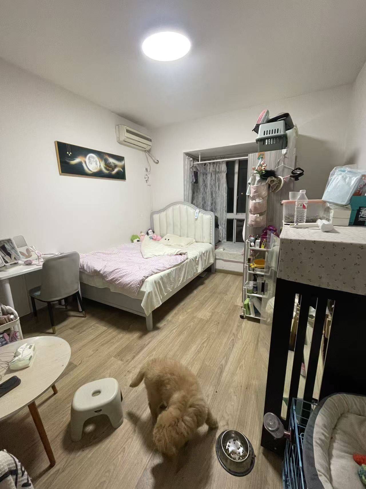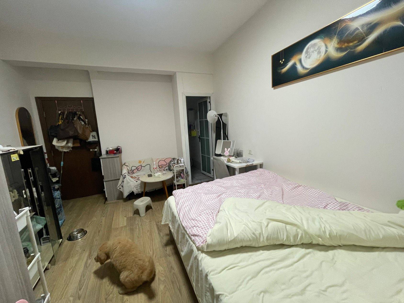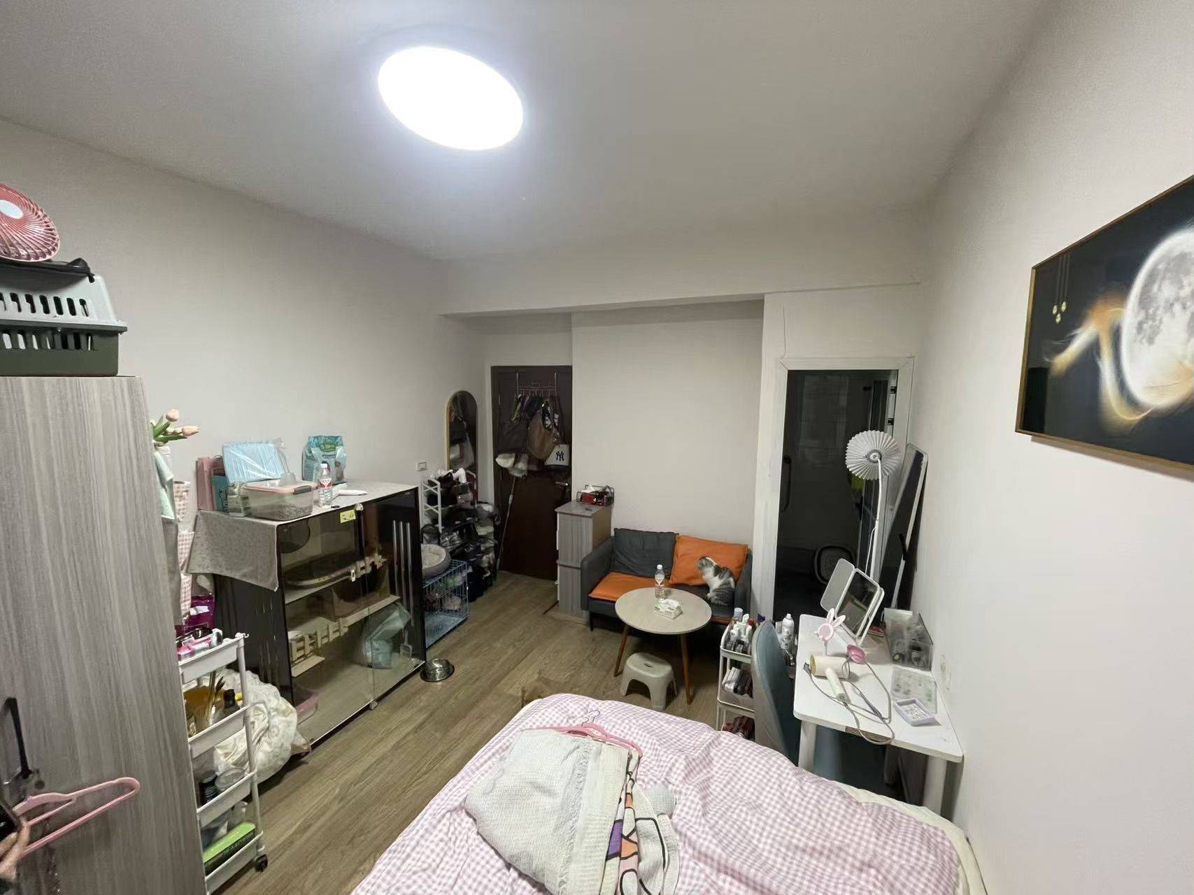 卧室配备软包大床与舒适床品,窗边预留了休闲角落;起居区有沙发、小圆桌,适合日常放松;独立化妆台满足梳妆需求,全屋收纳架、置物架充足,可轻松归置生活用品;空调等家电齐全,拎包即可入住。