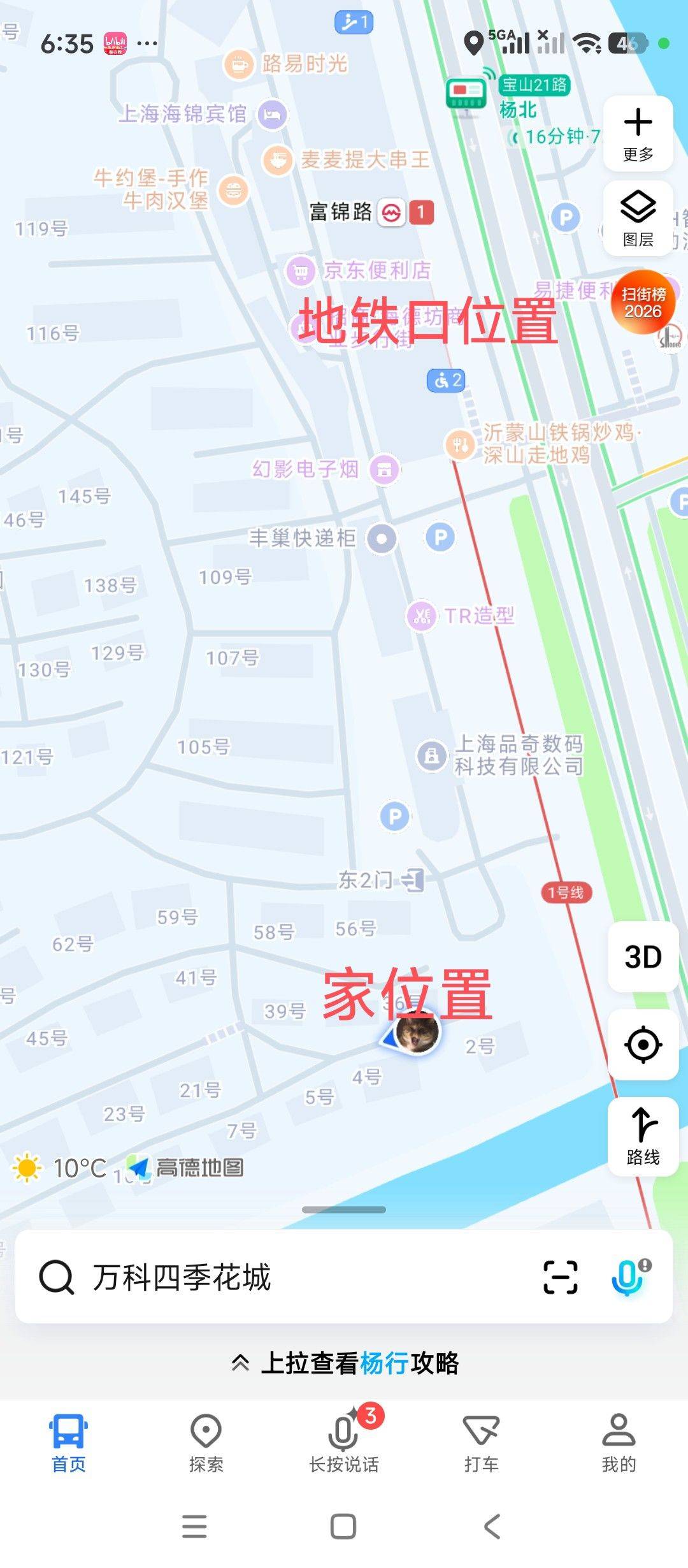 别墅位置比较近地铁口,也就二百米左右,我放了张导航截图供大家参考。小区是别墅小区,没有高层,绿化环境好,小区外头是商业街,各种小吃快餐,有星巴克麦当劳全家。另外小区里可以停车,月租二百元。