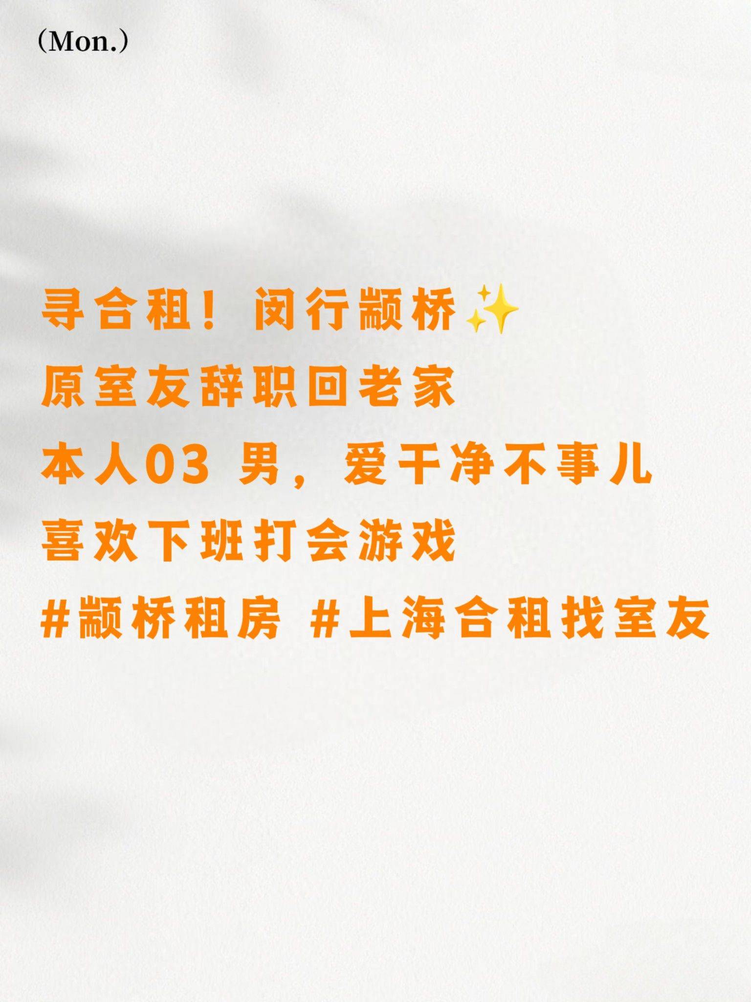 👉 基本情况 📌 房子在颛桥附近,7月到期,相处愉快可续租~公寓价格是1900左右,没有家电是我自己买的,可能会多收你100 🛏️ 上下床配置,家电齐全(都是我自费买的,放心用) 👨 本人男,性格随和,喜欢下班打会游戏,希望找个爱干净的男生室友,可以一起打游戏 ✅ 生活便利 🍳 独立厨房,做饭自由,再也不用吃外卖啦 💧 水电平摊,费用透明,每月AA超省心 📍 周边商超方便,取快递都很顺路 💡 入住小贴士 - 视频是当时看房拍的,想看现在实景可以私我发你