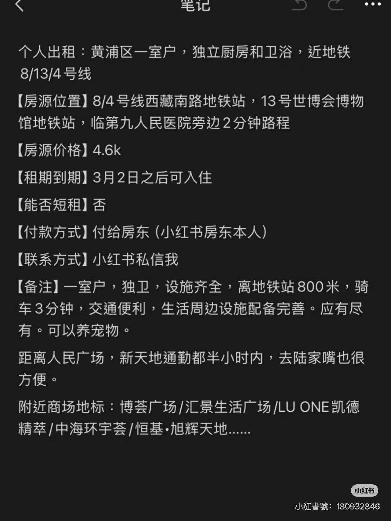 房东本人 寻一个素质高且投缘的长期租客(4.4k/月) 座落于第九人民医院旁边,一室户,位于四楼 适合单人住或者情侣住, 有独立卫浴和厨房,室内配件齐全(新装修过两年多)家电设施都是全新。 交通便利,设施齐全,随时可看房 有兴趣请私信我,谢谢! 可养宠物,希望找到素质高并且投缘的租客。