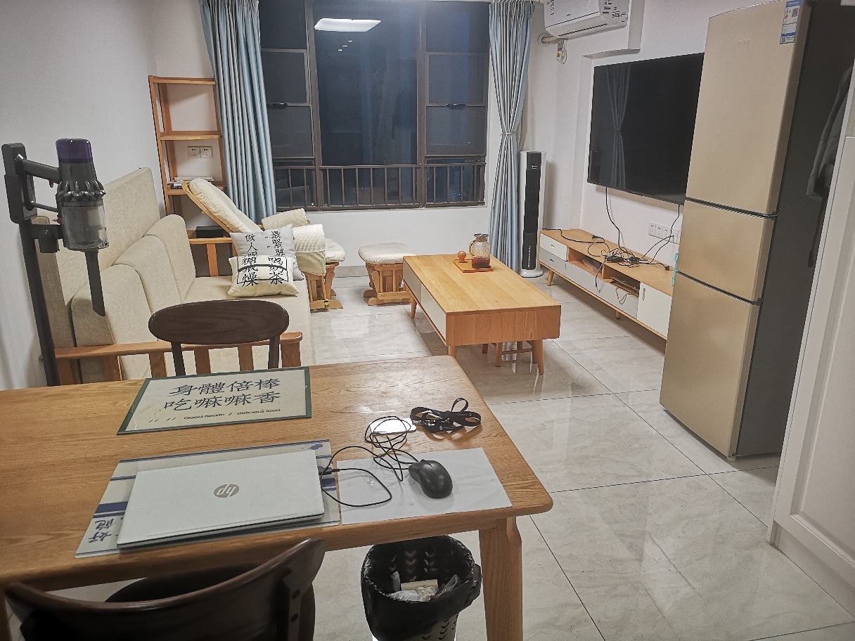 二房二厅一卫。 中高楼层 封闭式园林小区,人脸识别进出 入户门锁为指纹锁(数字密码也支持) 一楼:地板为瓷砖 客厅:二米沙发床(拉开变床看电视),摇摇椅 餐厅:一桌四椅,桌子1.4米长,够地方。 厨房:油烟机、其他吃饭家伙收柜子了,洗菜盆接上热水,冷暖自选,出水头能拉伸方便洗台面。 楼梯底下是储物间和鞋柜 餐桌窗旁边是洗烘机、晾衣杆 二楼:地板为木纹砖 主卧1.8米大床(横竖都能躺*<(¦Q[▓▓ )、衣柜、书桌、 为了避免六点多太阳光照醒,注意拉上窗帘_(:3」∠)_ 次卧1.5米床(没有配其他东西,因为是从杂物房变为书房变为次卧),优点是安静 一个沐浴+卫生间(坐厕) 一个小阳台 小区出口正对着香江国际写字楼(如图) 交通:金州地铁约800米,金隆公交站约200米 教育:金隆小学校本部、南沙第一中学高中部、金州小学 医疗:广州妇女儿童医疗中心(南沙园区)、南沙第一人民医院(南沙中心医院) 生活购物: 三百米内有板头市场(蔬菜水果生鲜肉类)、万家超市、健身房、KFC、肯德基、星巴克。 附近餐馆也有不少,比较有名的是广州酒家,一公里多的距离。 三公里内有万达广场(看电影) 休闲:南沙区图书馆(早八晚九,周三闭馆)、儿童公园(免费)、蕉门河公园(免费)、黄山鲁树林公园(爬山) 全实木家具(原始原素和林氏木语) 家电齐全: 65寸Sony4K彩电(壁挂) 小天鹅8KG滚筒洗烘洗衣机(烘干功应对回南天,就是广州的2~4月份,其实端午节之前都是比较潮湿的,回南天过后是台风季节,经常下雨) 60升电热水器(你爱洗多久就洗多久) 客厅、主卧、次卧都有单独的冷暖空调 窗户都有纱窗,不用担心蚊虫 空调均为冷暖空调,冬天制热 不短租,民用水电,物业费一个月130+。