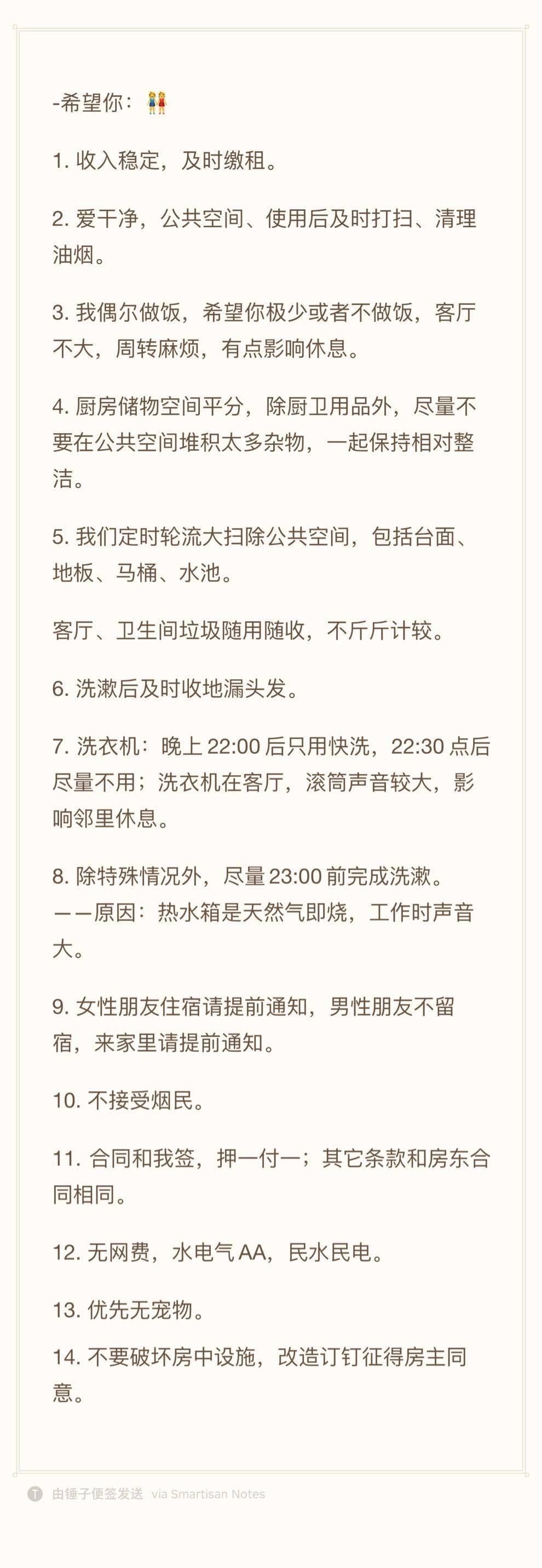 我的情况🙋‍♀️ 1. 工作相对稳定、朝九晚六。 2. 有只白色田园猫,胆小喜静,很少出现在公共区域。 3. 希望我们有话直说、有商有量,且互相尊重,维护公共空间,尽量不相互打扰。