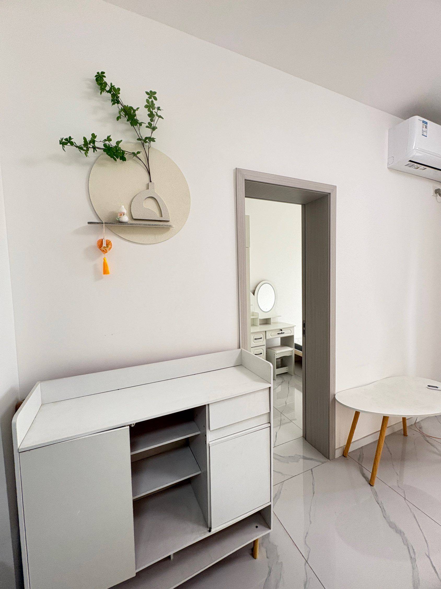 配置:客厅沙发可以变1.5米床,一个卧室,床1.5米,独立厨房卫生间,空调冰箱洗衣机都有配置,鞋柜一个,衣柜两个,有个小吧台