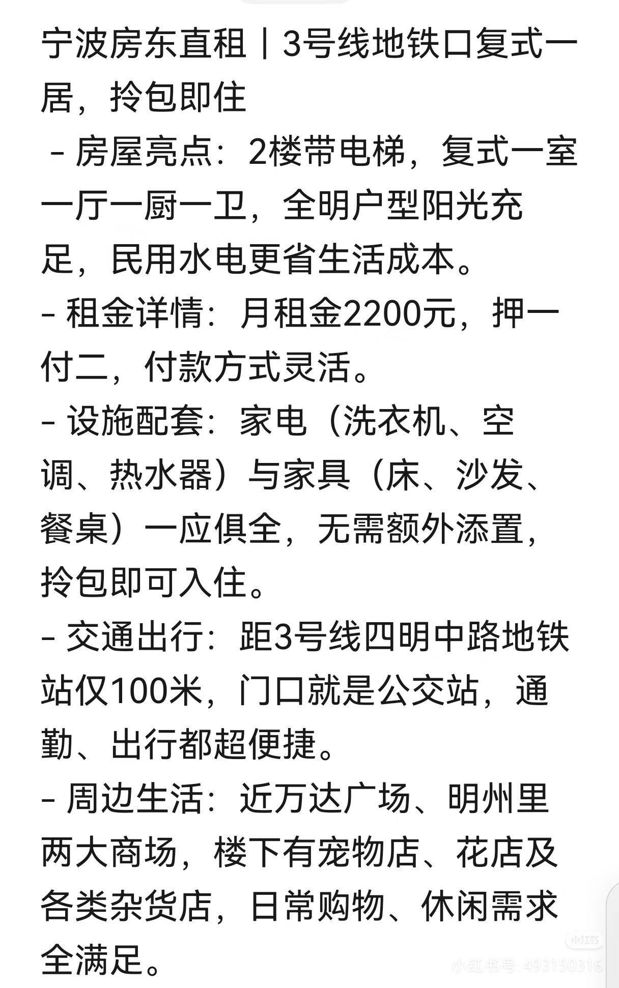 Rent : 2200RMB/M