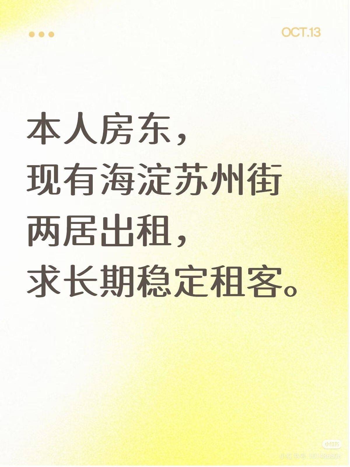 房东直租小南庄两居 位置:海淀区小南庄社区 (导航万泉庄小区,城乡仓储超市后面~) 🎈房子基本情况: ·南北通透两室一厅,65平 ·带阳台采光超棒 ·3/6层,不临街很安静 ·物业管理很负责 🎈交通便利: ·亲测8分钟从家出门到苏州桥地铁站闸机! ·12号线+16号线双轨交汇 ·出小区就是万泉庄公交站,9条线路任选 🎈海淀妈妈看过来: ·万泉小学、中关村三小、十九中 八一中学、人大附中...全在附近! 🎈生活超方便: ·世纪金源、万柳华联、新中关 小电驴一骑几分钟就到了! 本人就是房东!骗人是小狗!! 另外不接受合租,不接受养宠物哦~