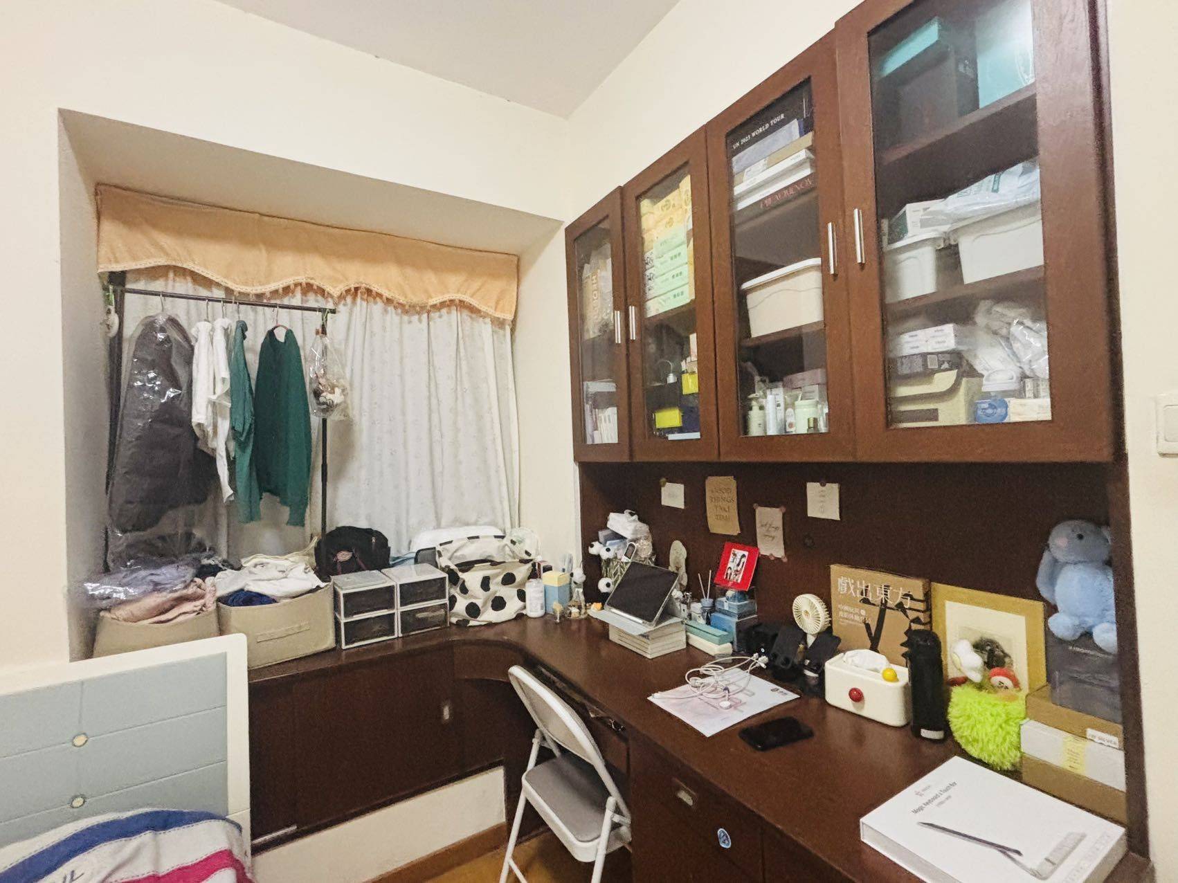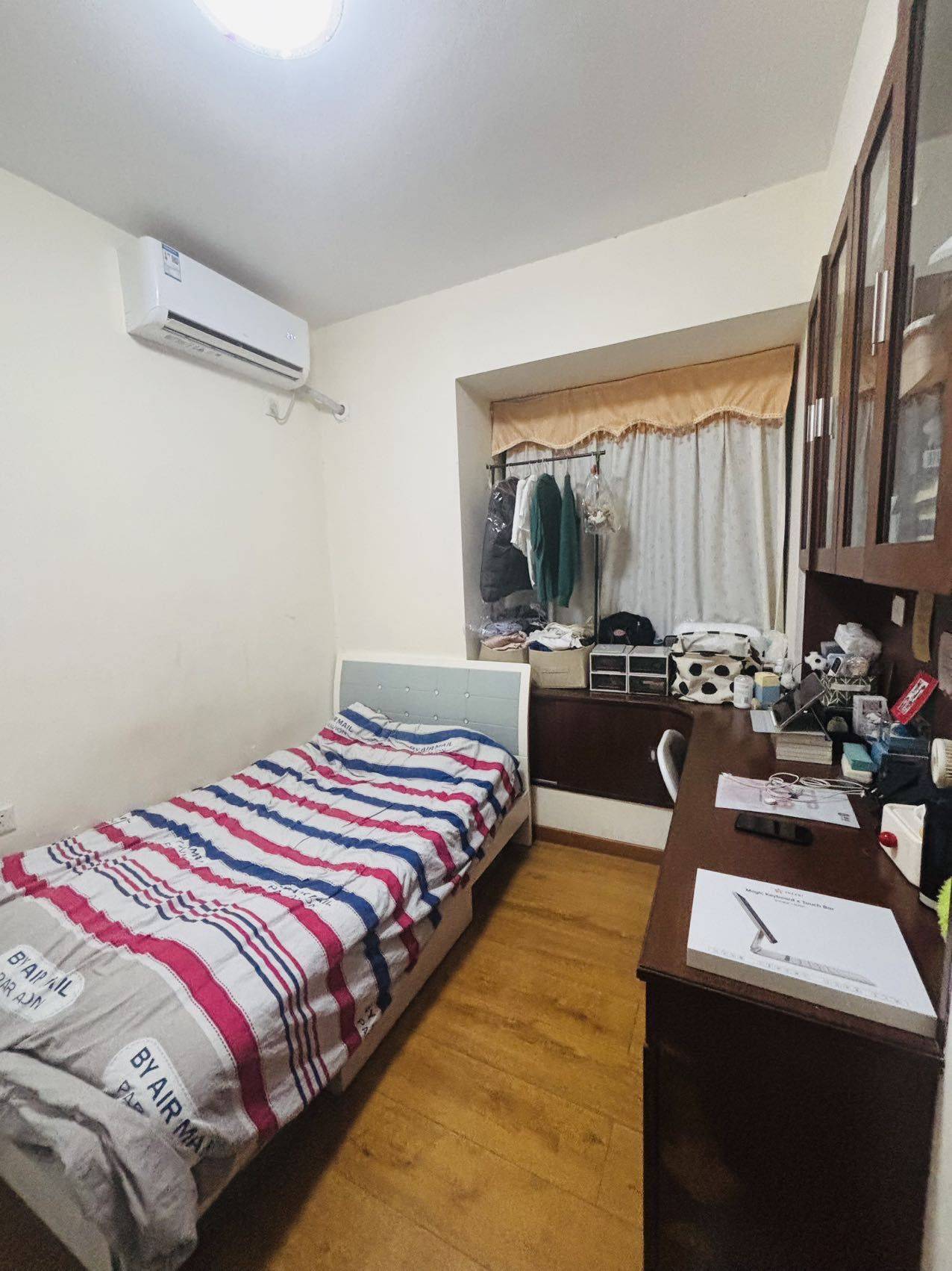 2⃣️房间基本情况:房子为三房一厅一卫一阳台,位于高层19层(共32层),共计91平,屋内冰箱、洗衣机、油烟机、空调等设备齐全。转租次卧10平左右,房间方正有窗,布局和配套精致,有学习办公储物一体的定制柜,储物空间较多,床1.4米,床尾有衣柜。