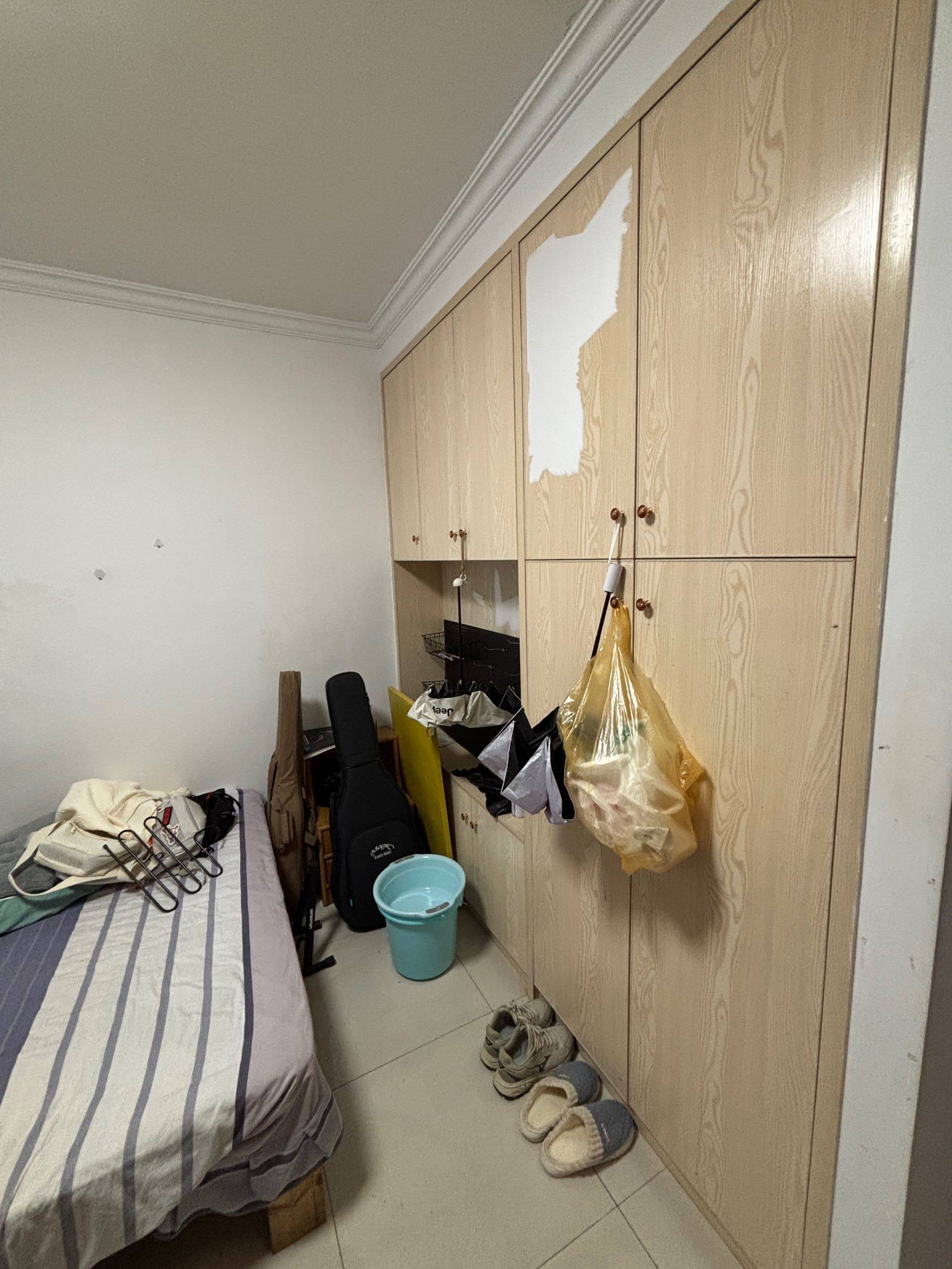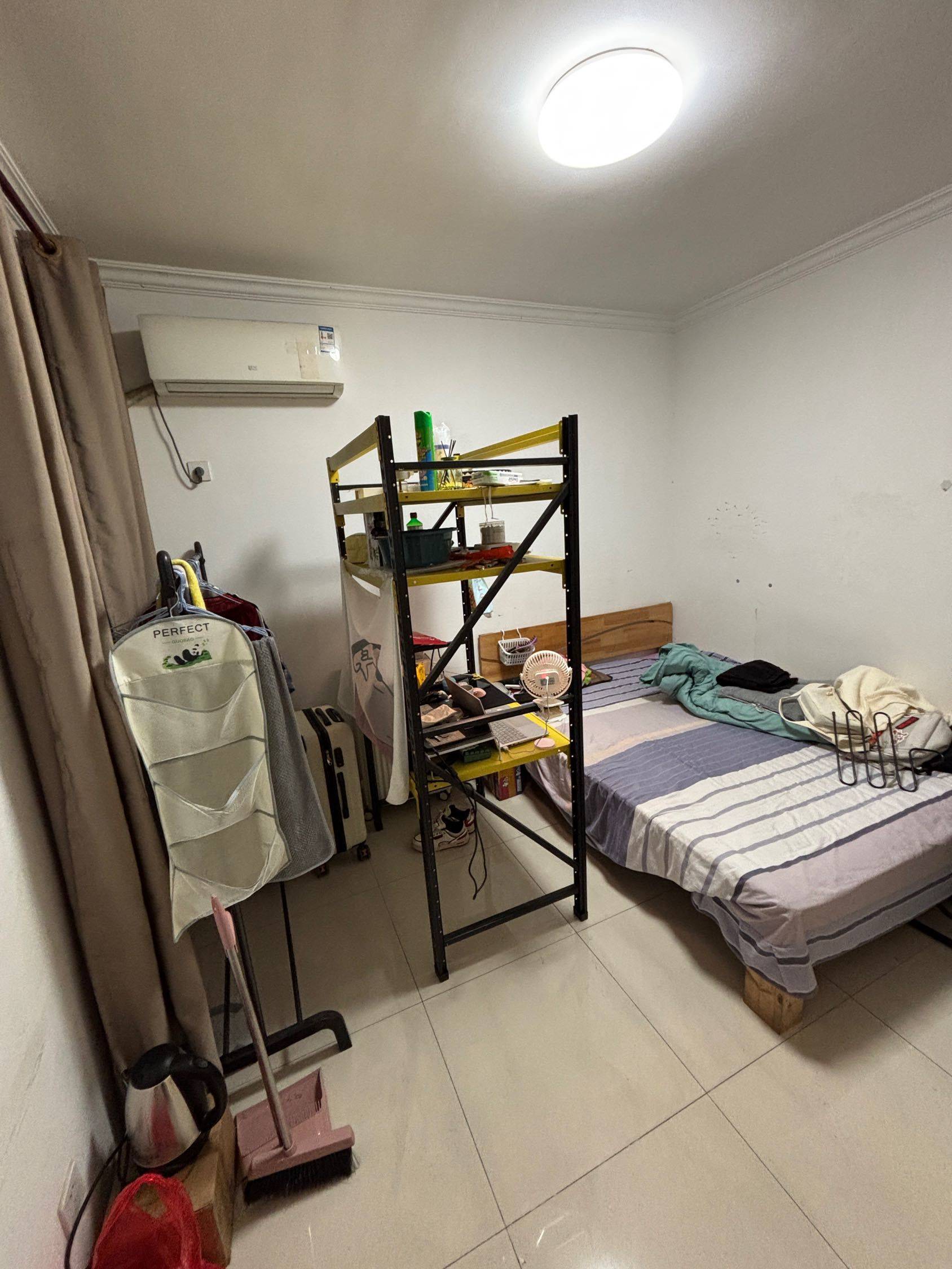 平安雅苑14幢工作变动现转租 民用水电!合租!合租!仅限男! 地理位置距平安桥地铁口500米 有室内阳台好晾衣服 另一个室友不用厨房可做饭 卫生间干湿分离冬天洗澡有暖灯 地面最近下雨频繁进出有点脏会打扫 卧室房间有窗户可以通风 房间内货架和晾衣杆免费送,不要可以拆 房间内柜子多,储物空间满满的
