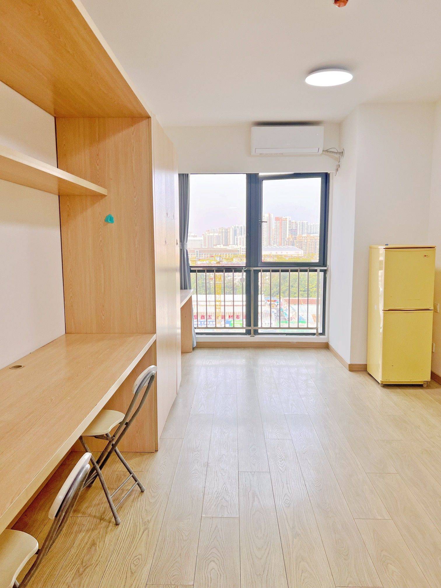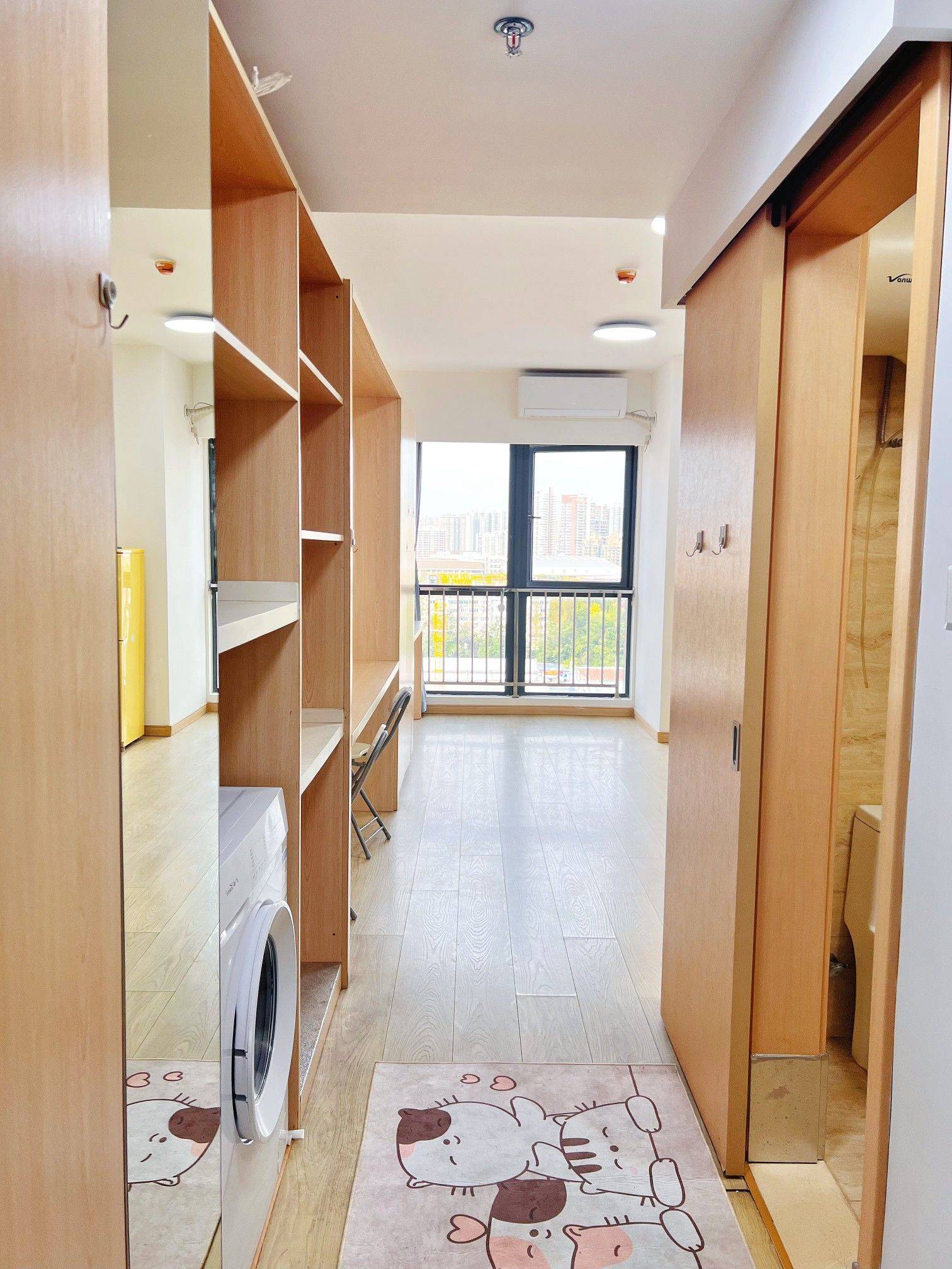 万科金色名郡精装修小公寓,房东直租! 我是房东,我是房东,没有中介费!不要再问啦! 合肥蜀山区望江西路万科金色名郡甲壳虫精装修小公寓出租。具体位置在:合肥名郡生活广场,楼下饭店,面馆,便利店,药房,菜鸟驿站,水果店一类全部都有,交通便利,有意者可私。房东直租,不要中介费。 朝向北,但采光好。 楼下有商场,购物、吃饭方便。 还有地铁站,出行方便。 合肥市17中就在小公寓对面。适合走读的学生或单身上班族。 房间内有衣柜、写字台、床、空调、滚筒洗衣机、冰箱、热水器、马桶、洗手池等家电家具齐全。 视野开阔,能看到远处的城市景观。 房间干净整洁,床、灯、窗帘、花洒、马桶、滚筒洗衣机等都是全新。 有意者可以随时看房。