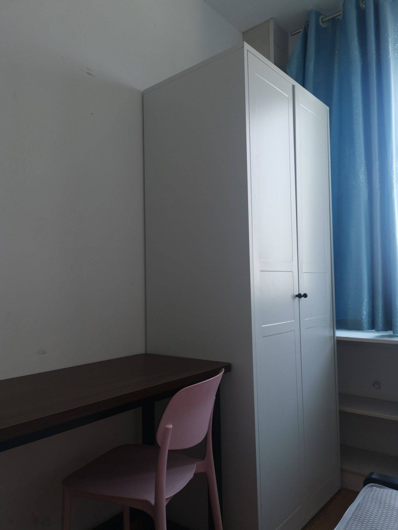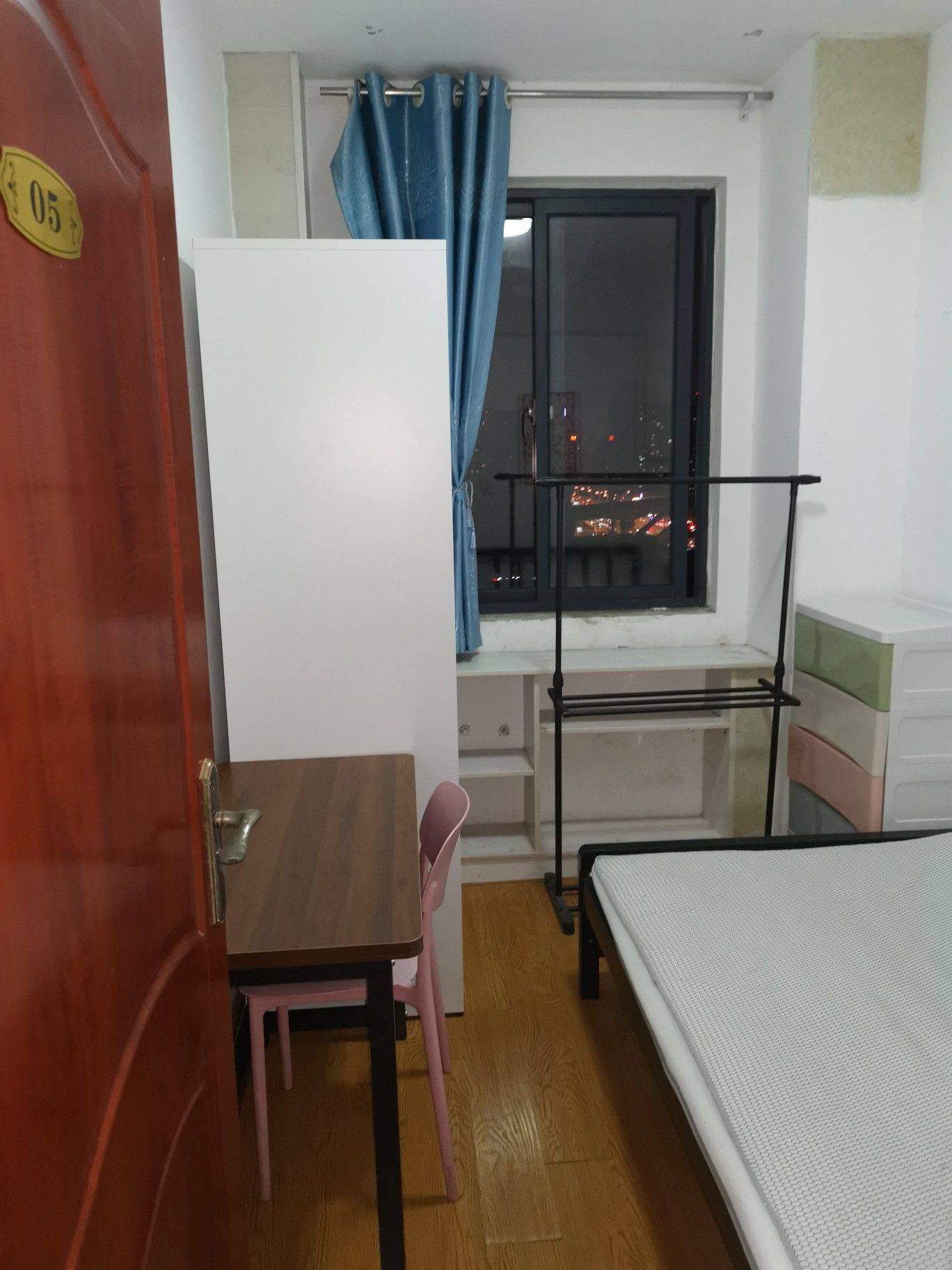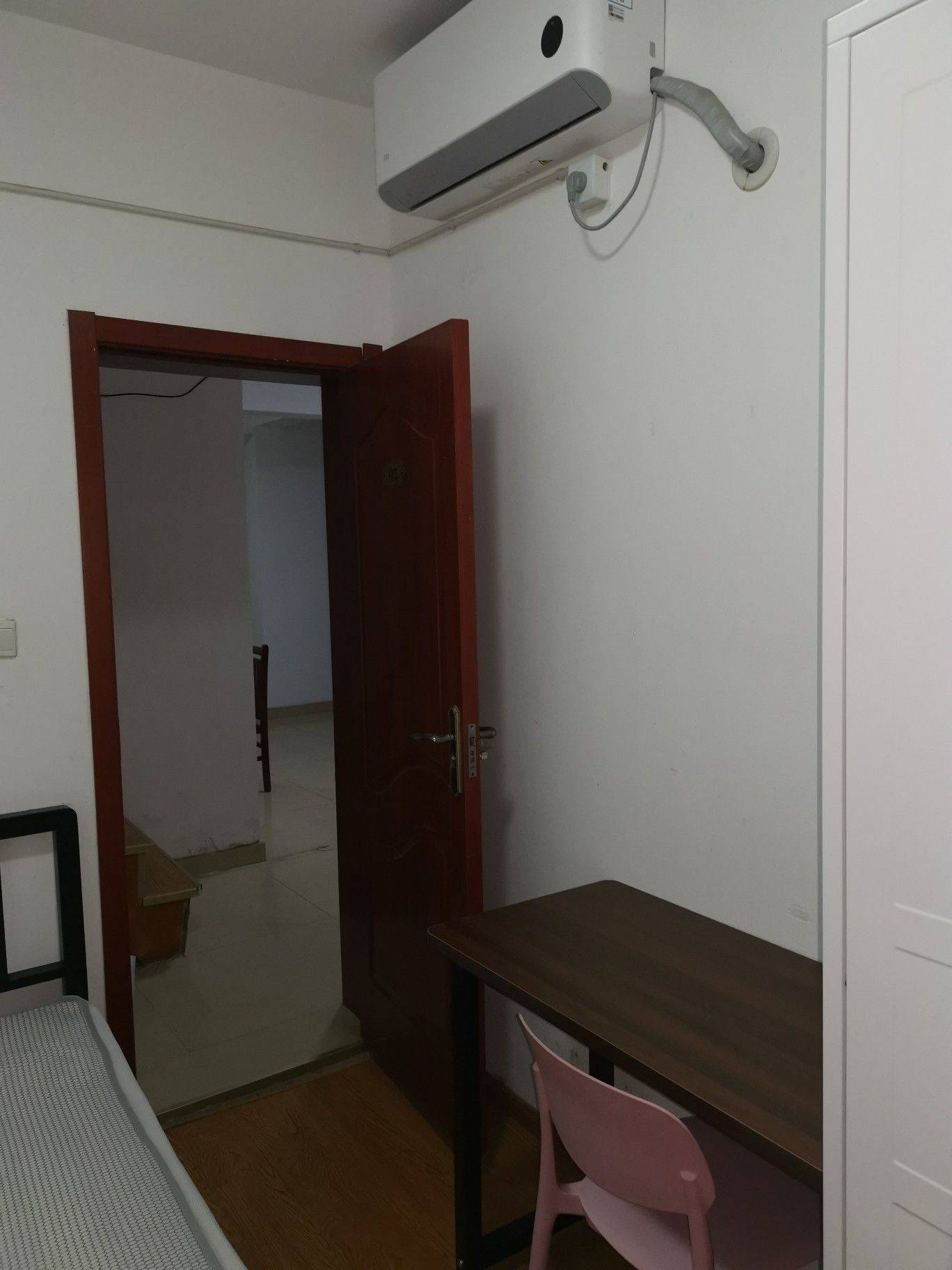 房间(附图1~4)位于楼下,朝北,原始结构,面积约7平方米,与其它房间不隔壁。配备独立电表、一级能效小米空调、铁艺床、实木芯书桌、塑料椅子、碳钢衣柜、塑料五斗衣橱、固定置物架、独立洗衣机。