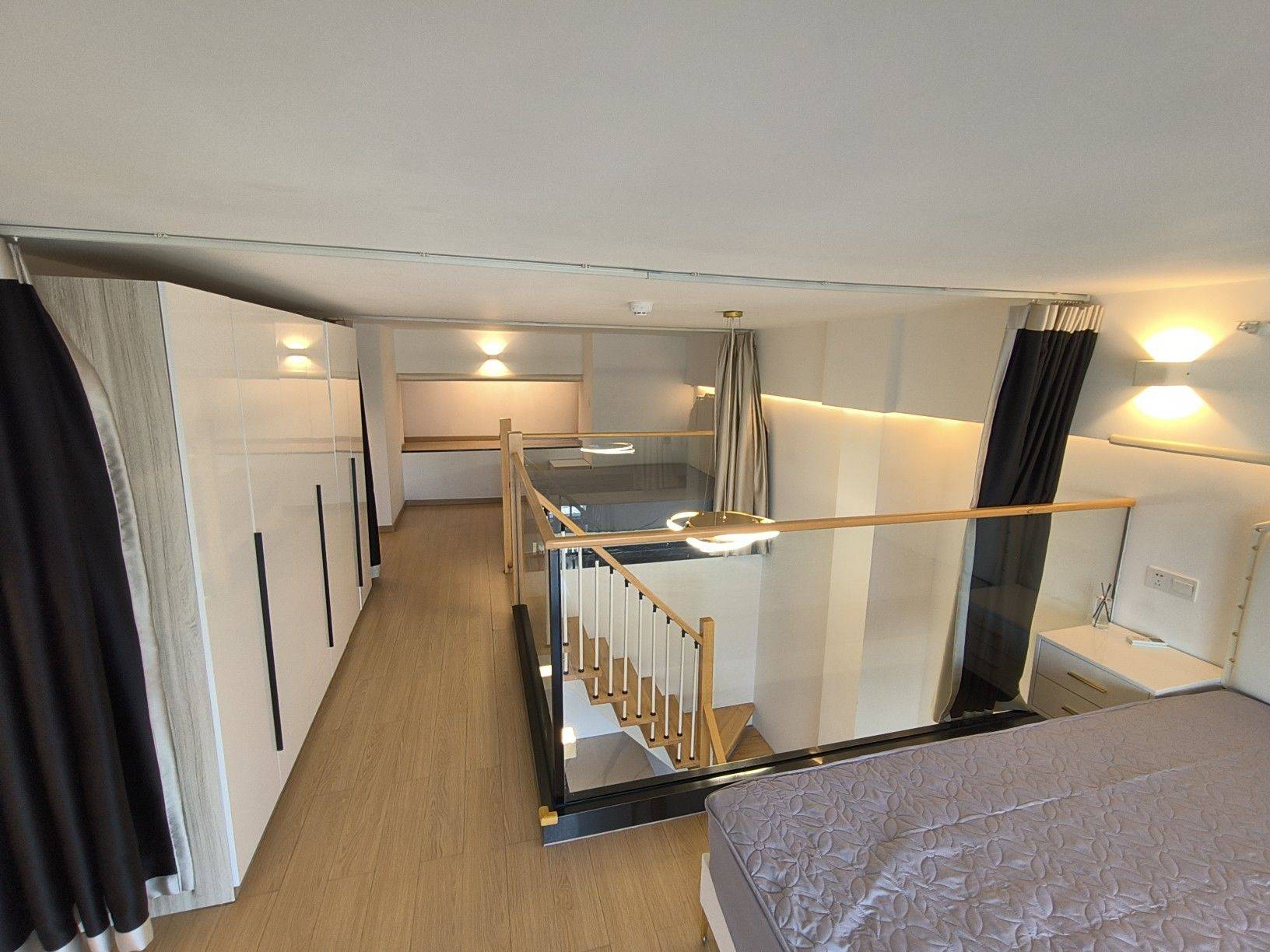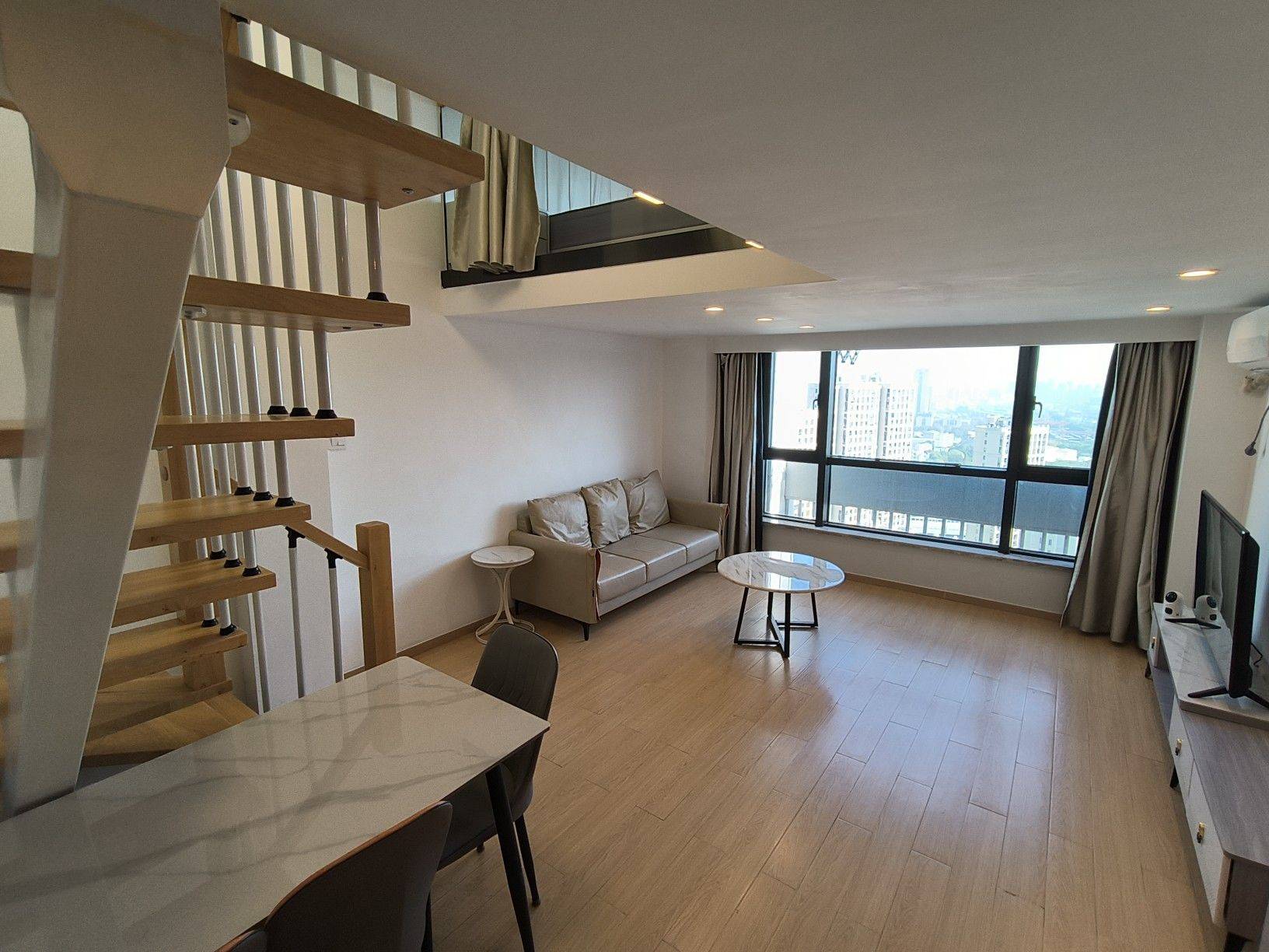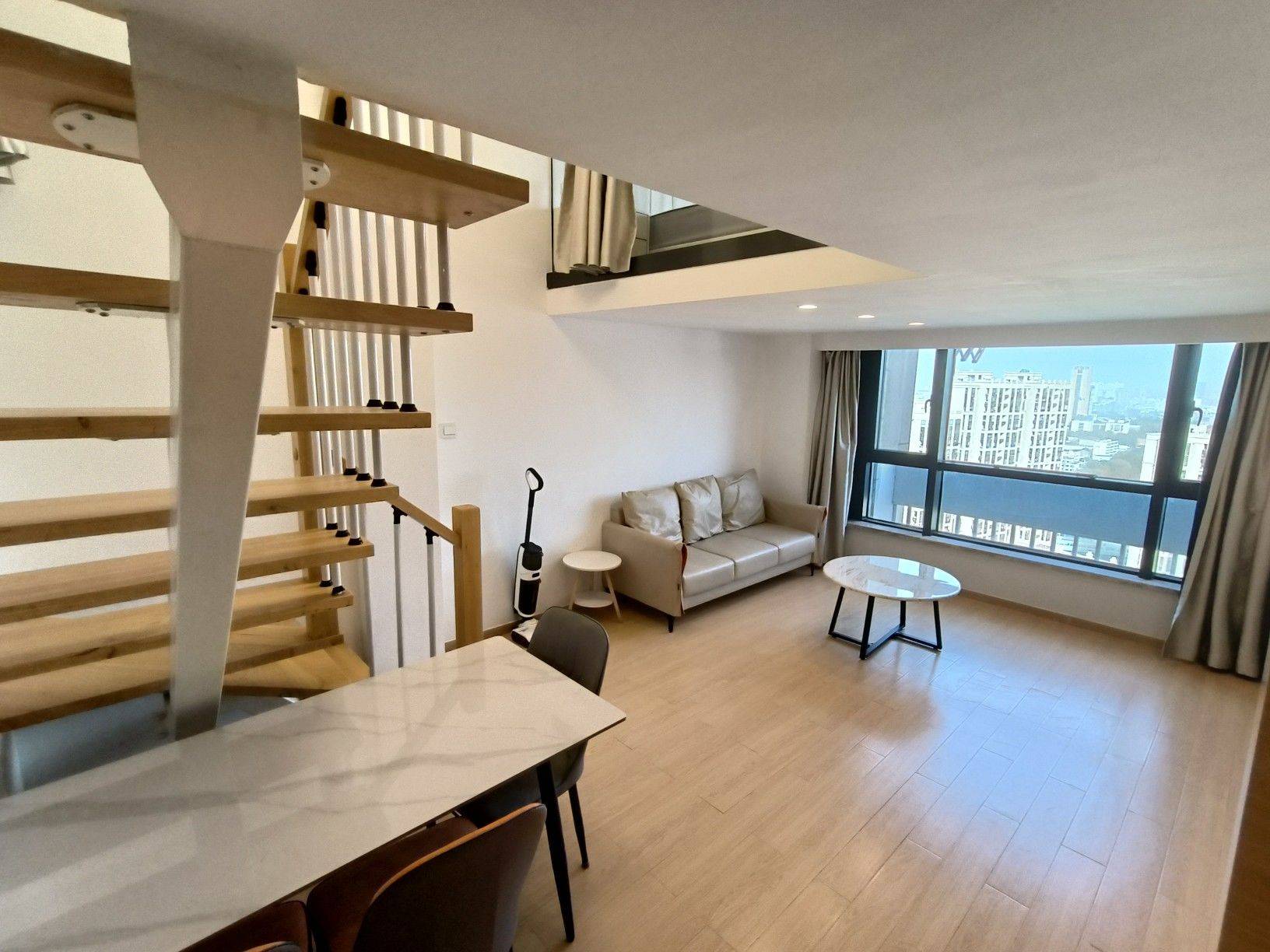 房东直租,2室1厅1卫1厨,朝东,落地窗采光优,已装晾衣架,跃层格式实际使用面积有60平米左右。家具配:1.8米床一张,1.5米床一张,各配一个床头柜;3个大衣橱;岩板餐桌配3张餐椅,三人位沙发,岩板边几,大理石茶几,电视柜。家电配:浴室暖风机,热水器,液晶电视,冰箱,油烟机,滚筒洗衣机,空调。谢绝宠物!