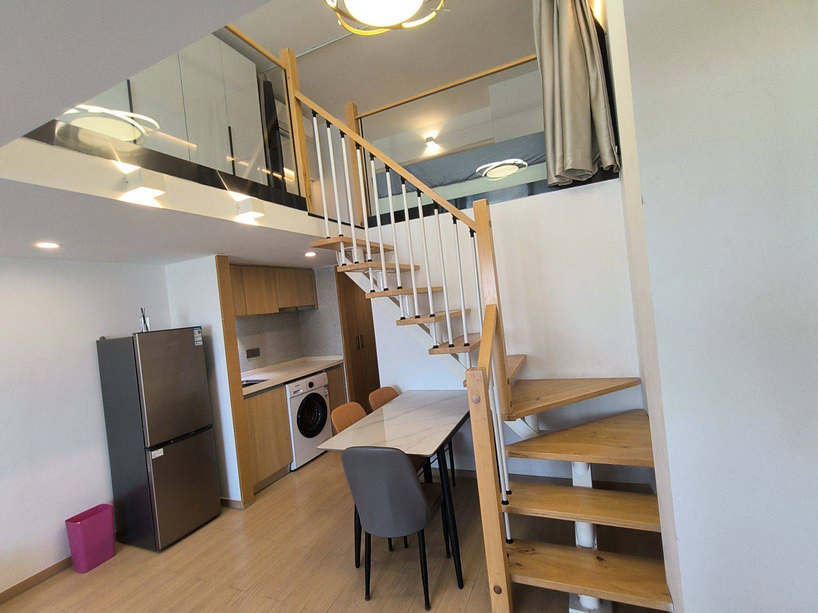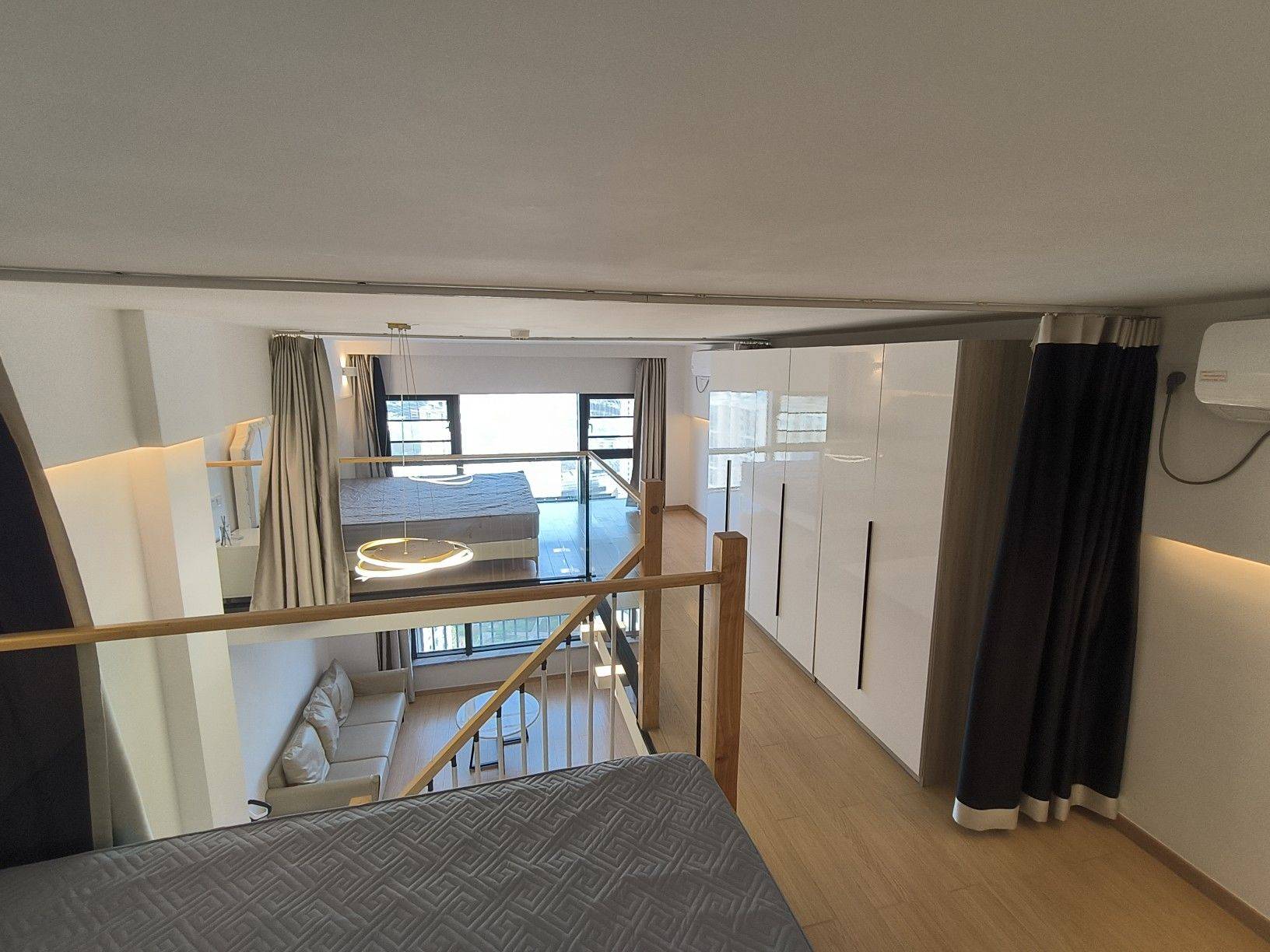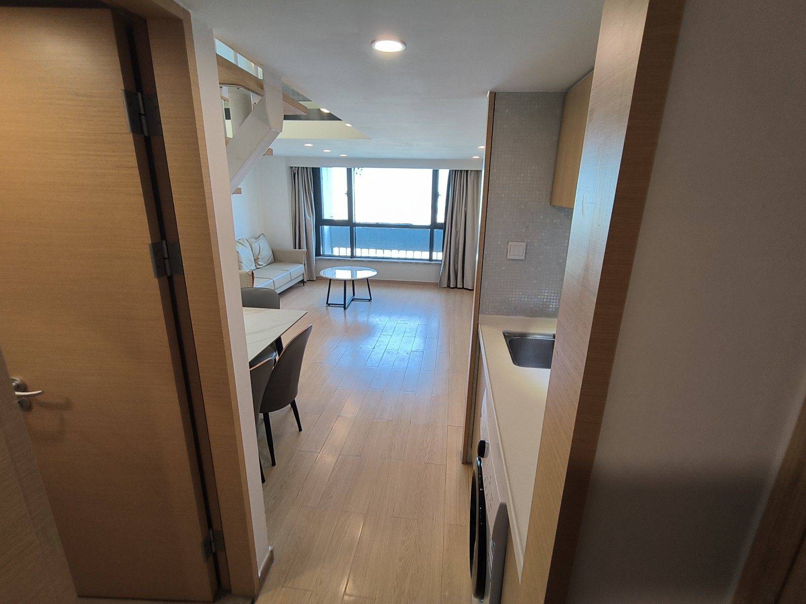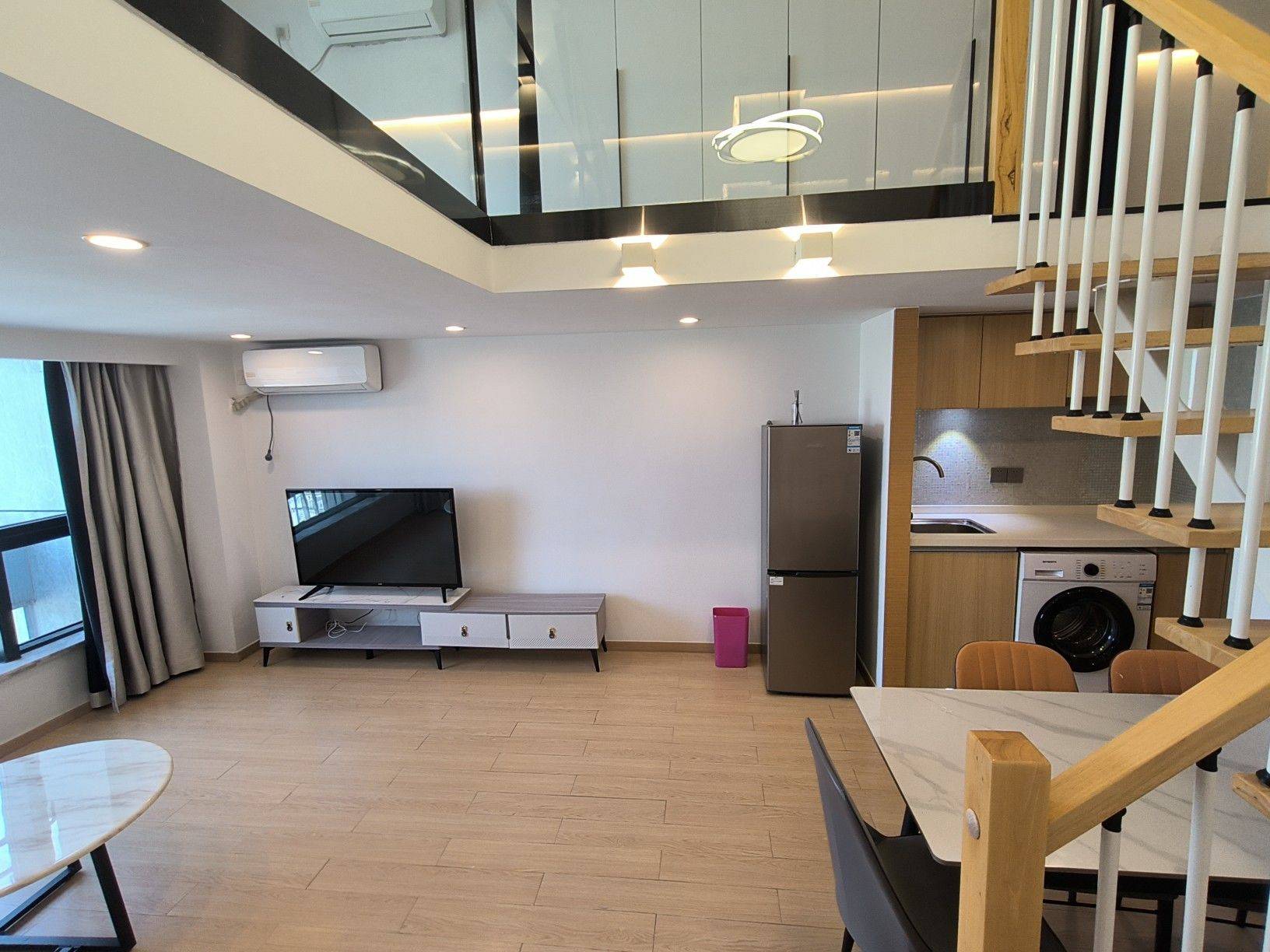 房东直租,2室1厅1卫1厨,朝东,落地窗采光优,已装晾衣架,跃层格式实际使用面积有60平米左右。家具配:1.8米床一张,1.5米床一张,各配一个床头柜;3个大衣橱;岩板餐桌配3张餐椅,三人位沙发,岩板边几,大理石茶几,电视柜。家电配:浴室暖风机,热水器,液晶电视,冰箱,油烟机,滚筒洗衣机,空调。谢绝宠物!