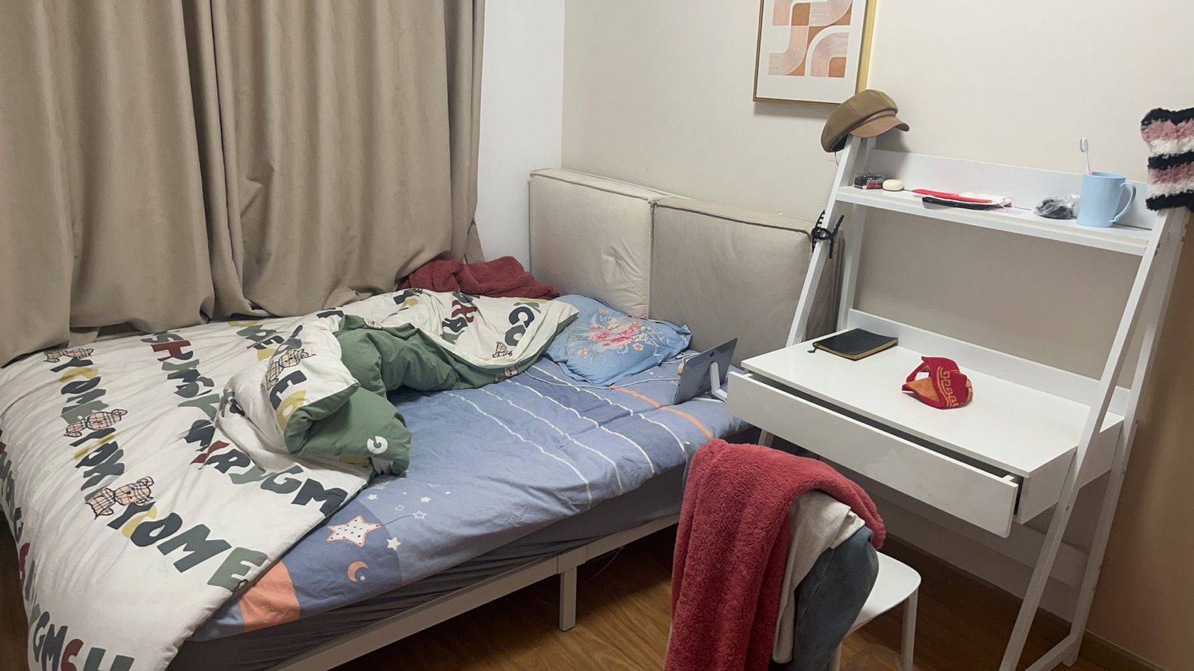 有衣柜和桌子还有个飘窗 离地铁站六七分钟的路程 离快递站也才五六分钟的路程 小区环境好 对面就是商场