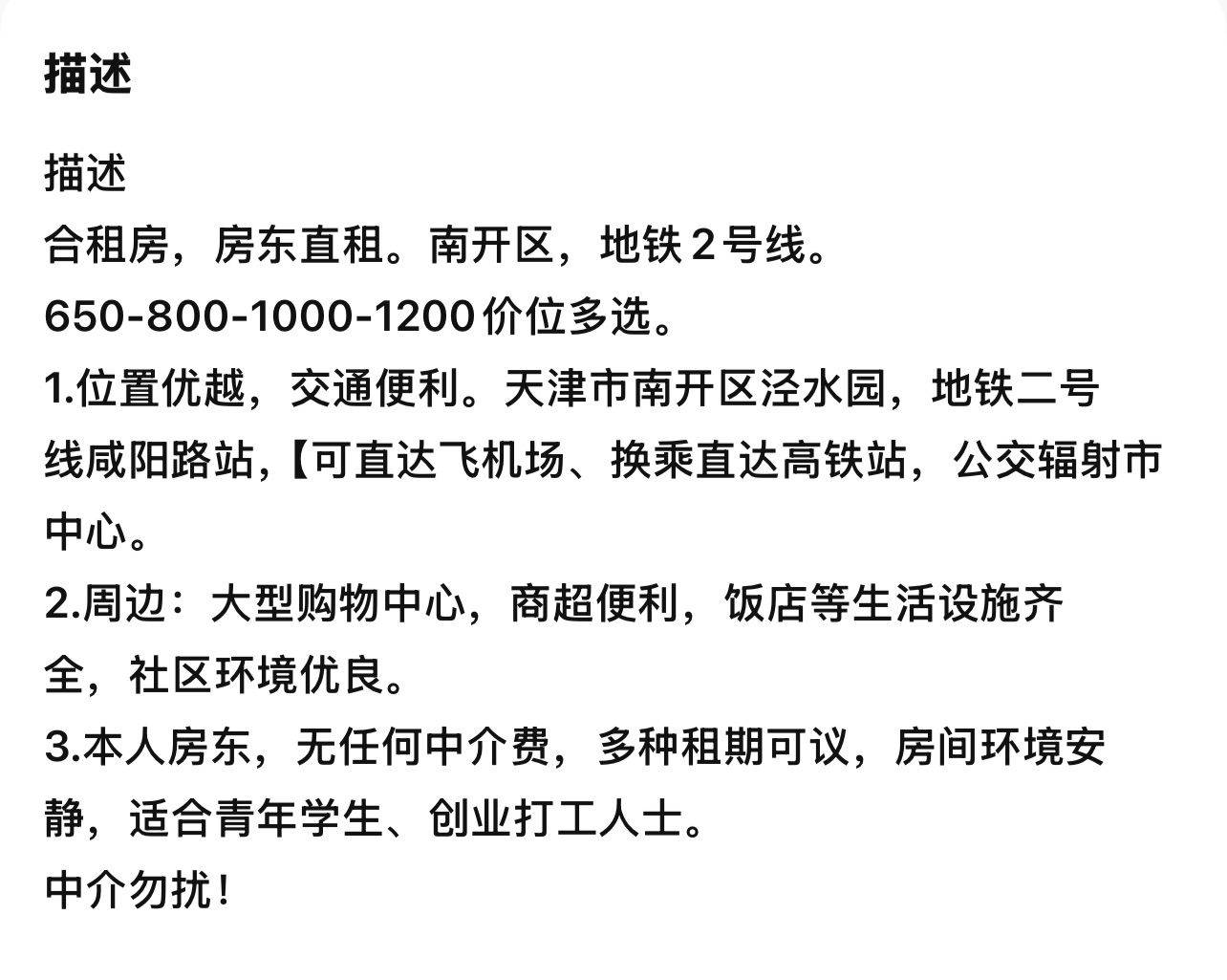 合租房,房东直租。南开区,地铁2号线。 650-800-1000-1200价位多选。 1.位置优越,交通便利。天津市南开区泾水园,地铁二号 线咸阳路站,【可直达飞机场、换乘直达高铁站,公交辐射市 中心。 2.周边:大型购物中心,商超便利,饭店等生活设施齐 全,社区环境优良。 3.本人房东,无任何中介费,多种租期可议,房间环境安静 中介勿扰!