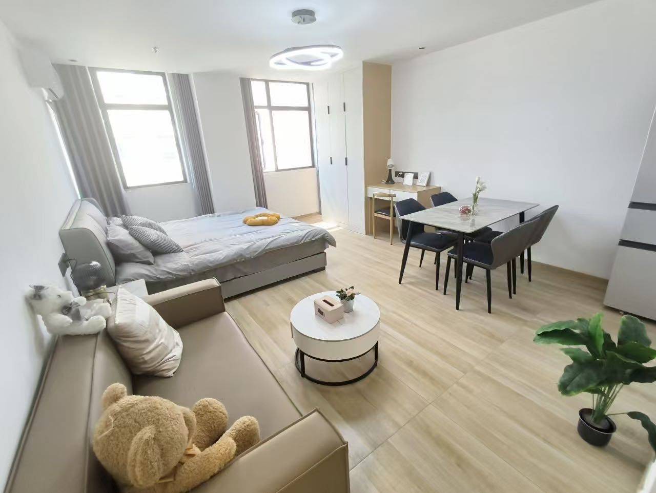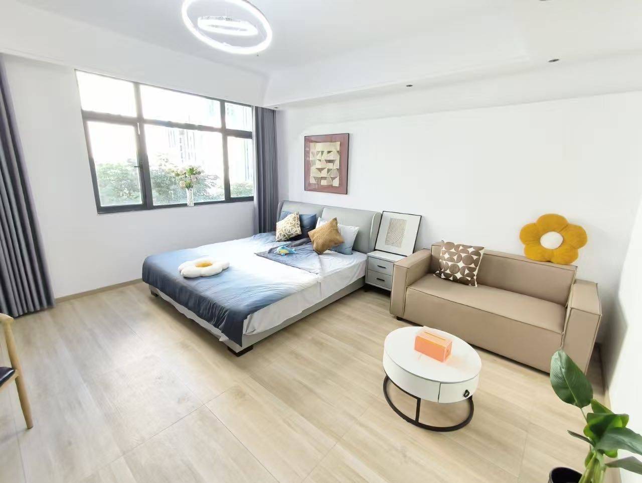 距离商圈骑车五分钟,距离地铁口两百米,一室一厅独立卫浴,全自动洗衣机带烘干,采光好,可做饭,有冰箱,养猫,包网络,东西坏了免费维修,安静隔音好,物业费我交了一年的不用再交,一个月大概水电七十元左右,一楼大厅就是24小时自助便利店,青年公寓,住户素质还可以,走廊有人打扫
