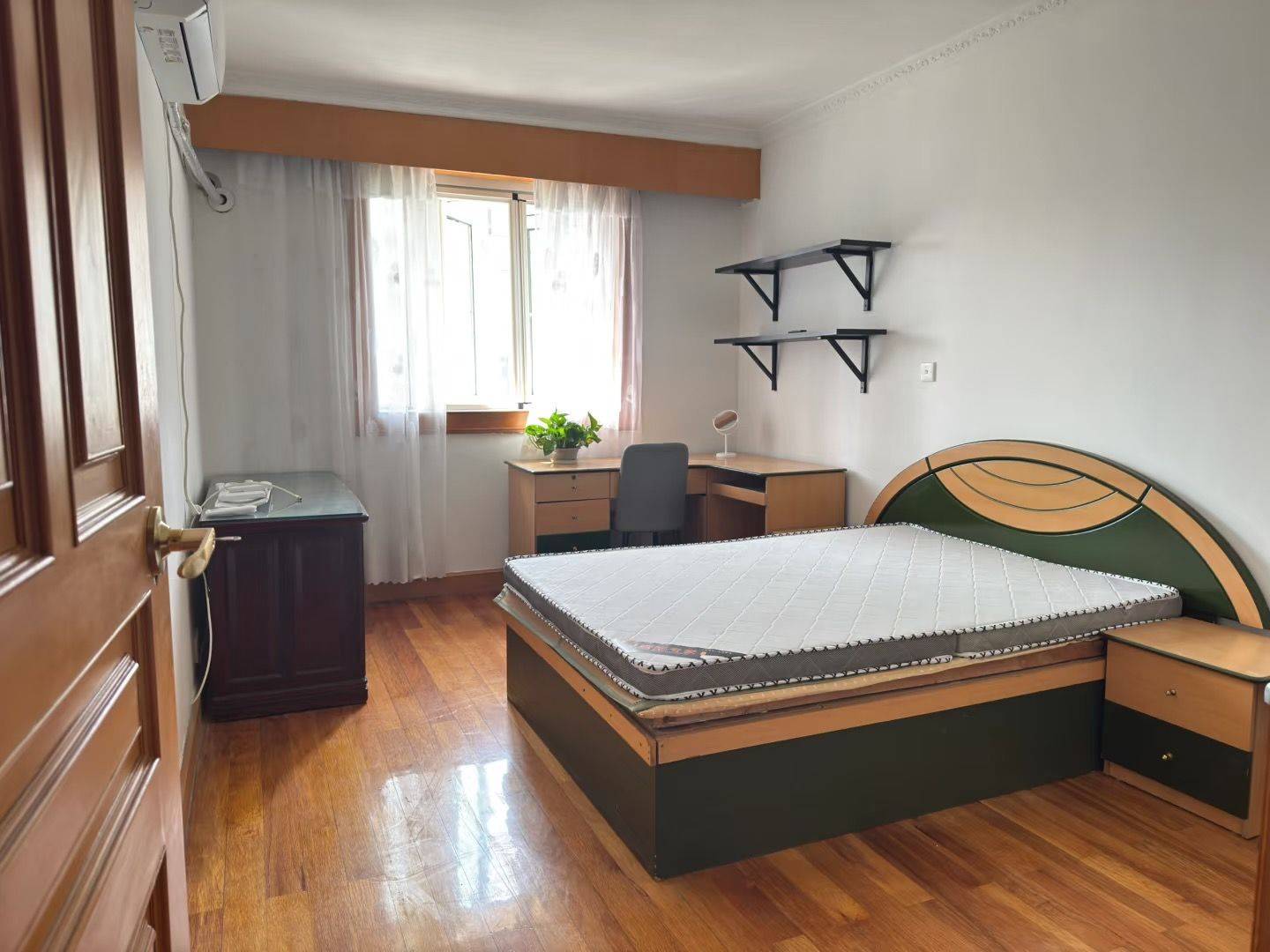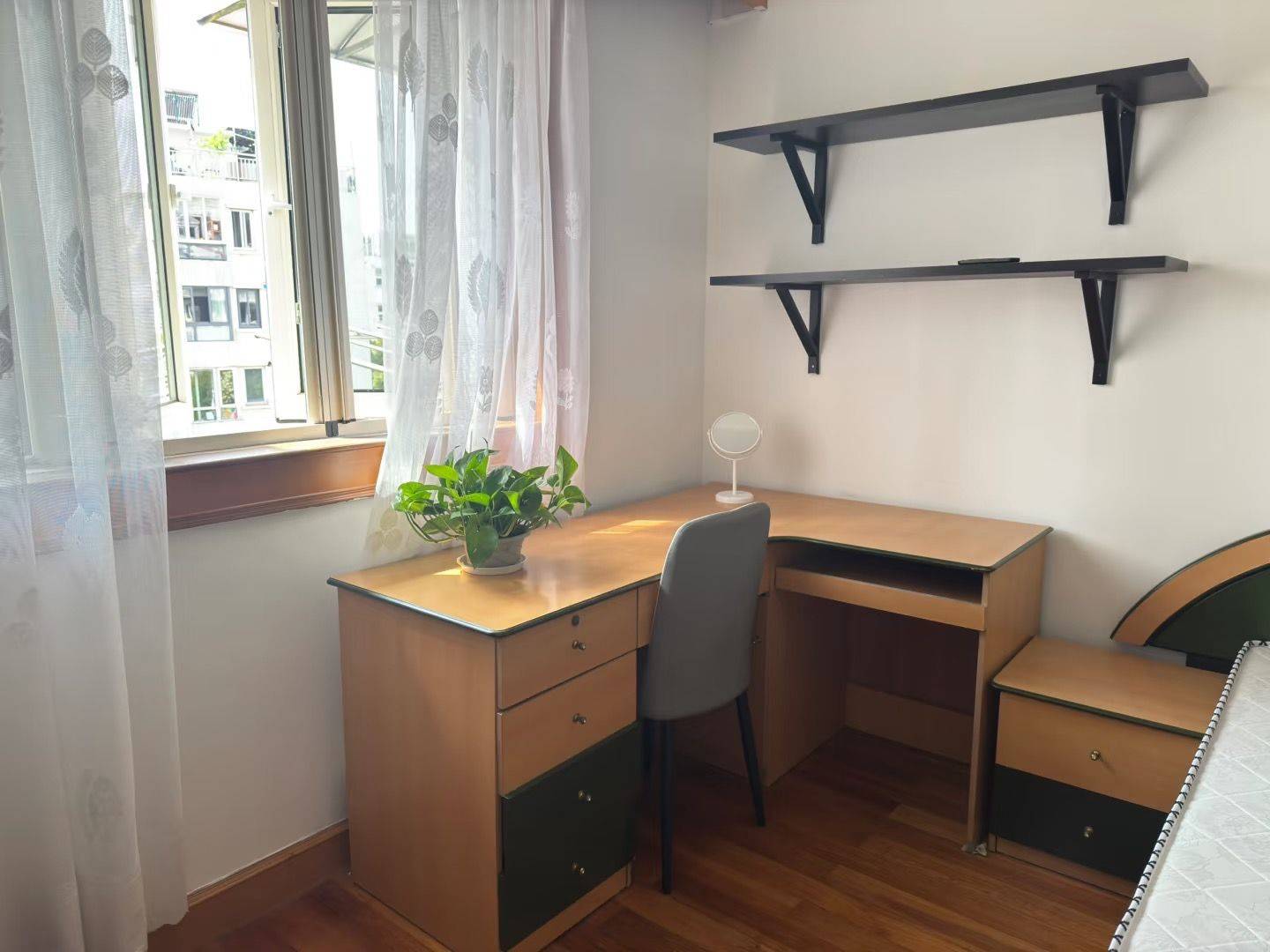 d.窗外有晾衣杆,室内补充双杆移动挂衣架,书桌很大,进门有鞋柜,全新灯具明亮